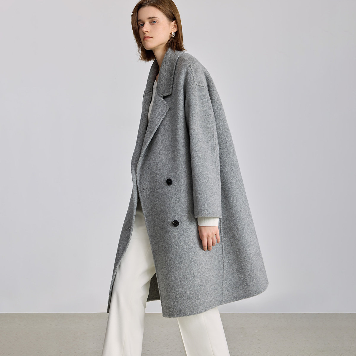 高端灰色双面羊毛大衣女长款2025新款韩版双排扣过膝毛呢外套
