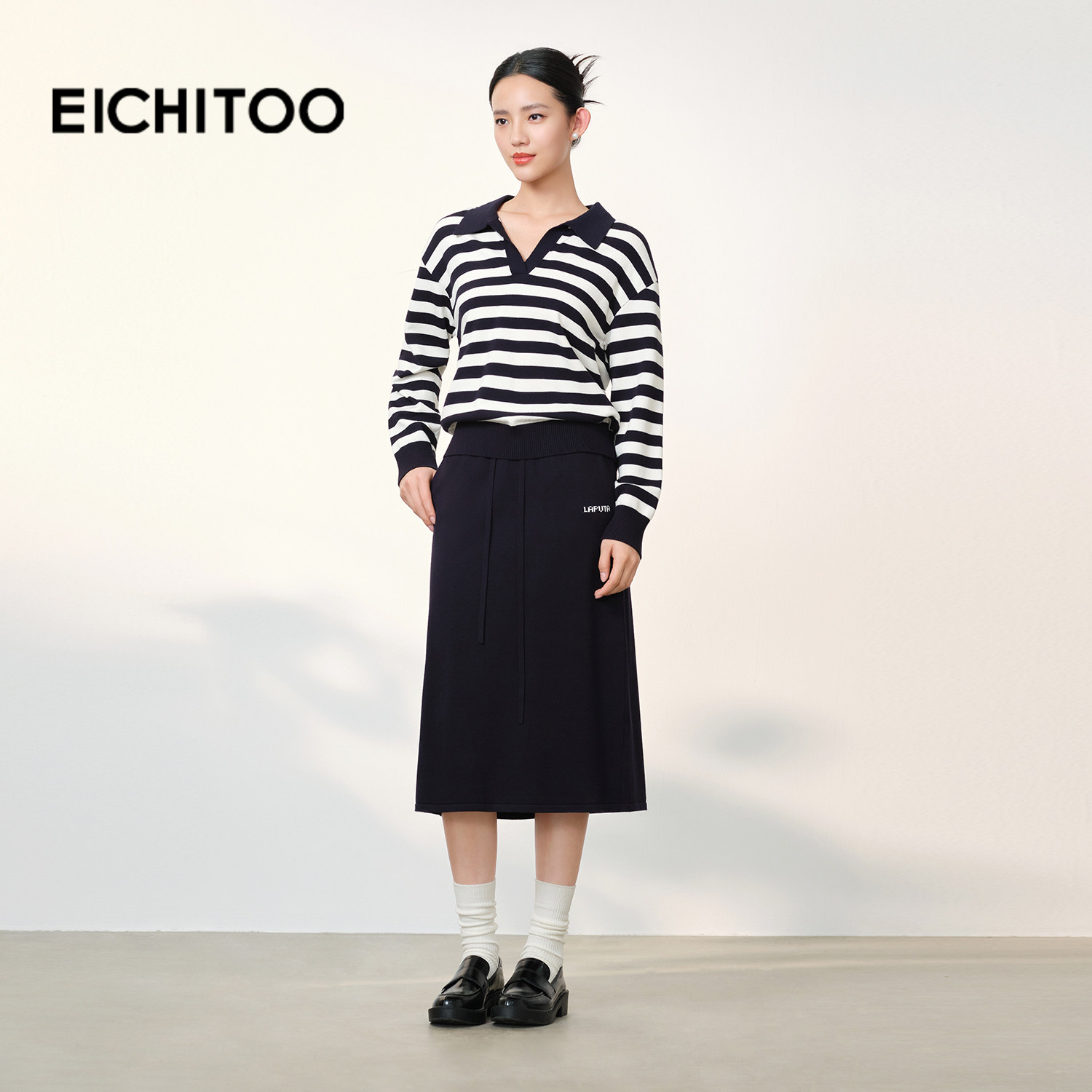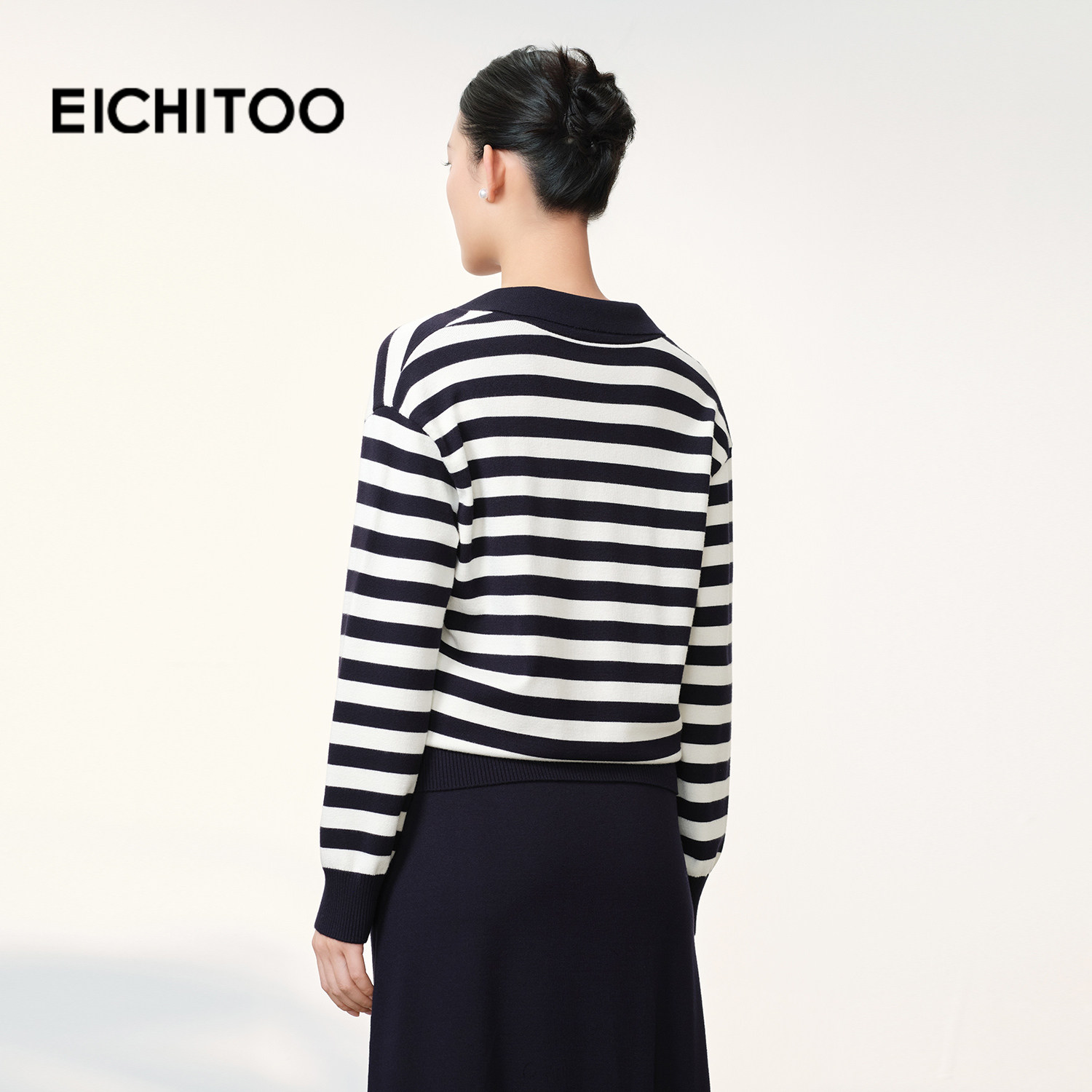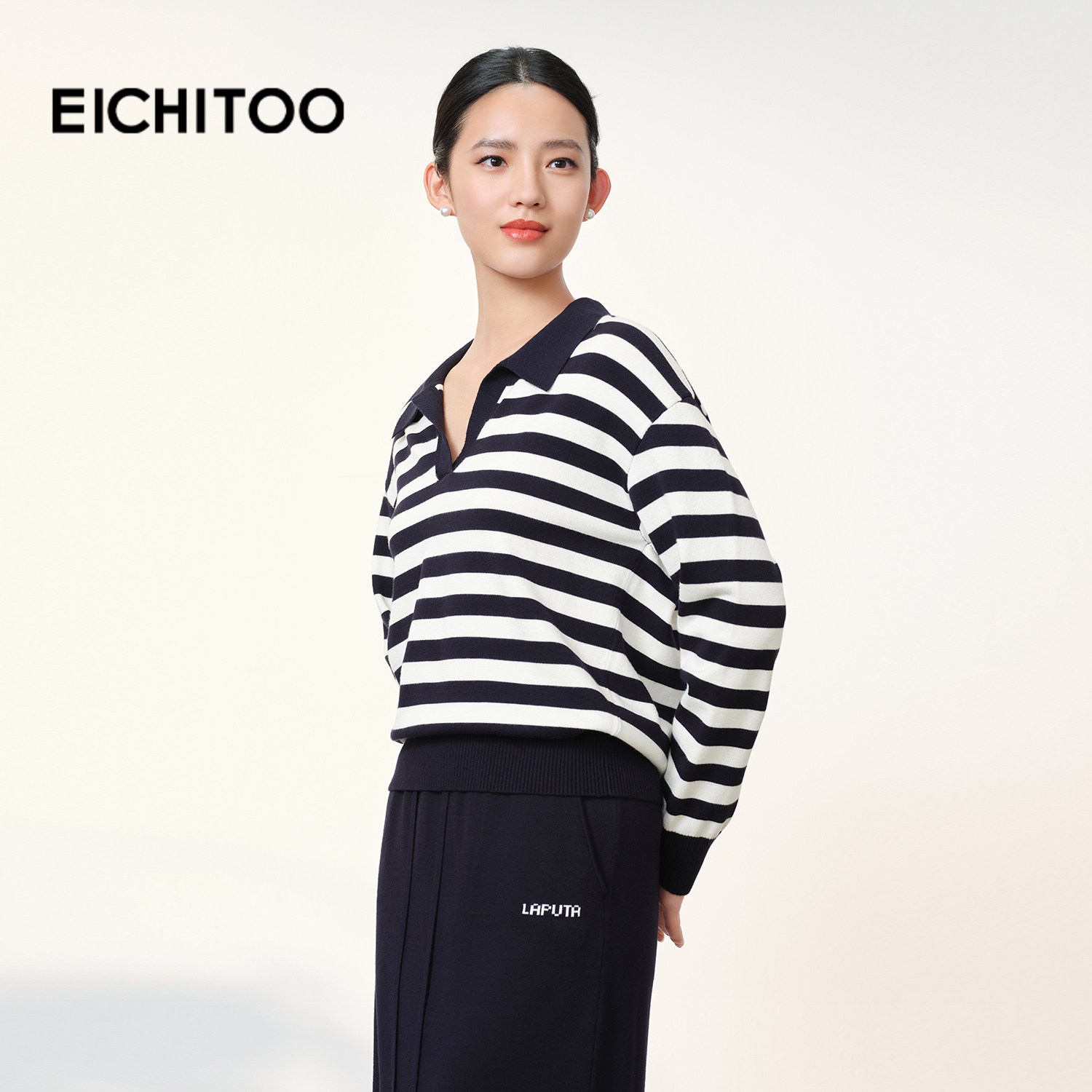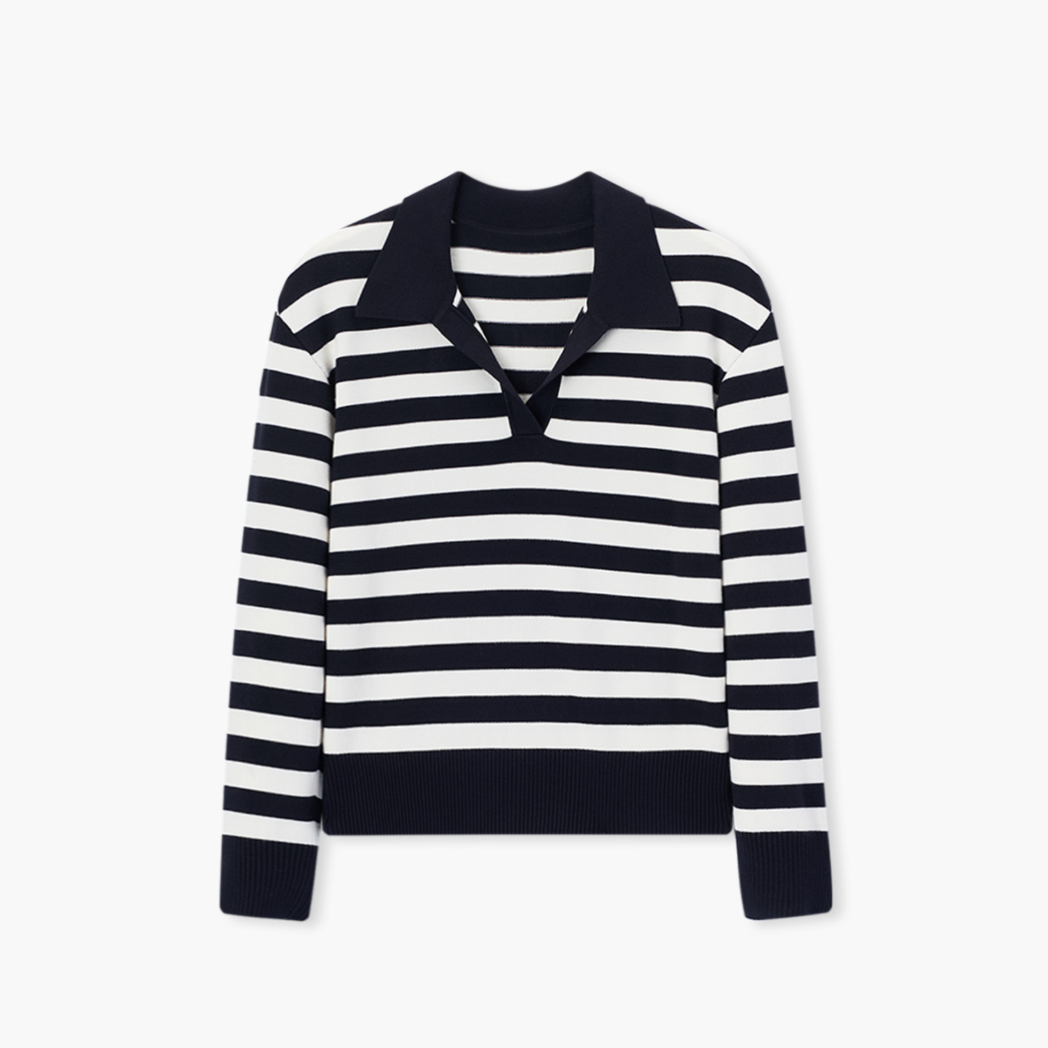 爱居兔法式V领藏青条纹针织衫女2026春季新款时尚显瘦通勤毛衣