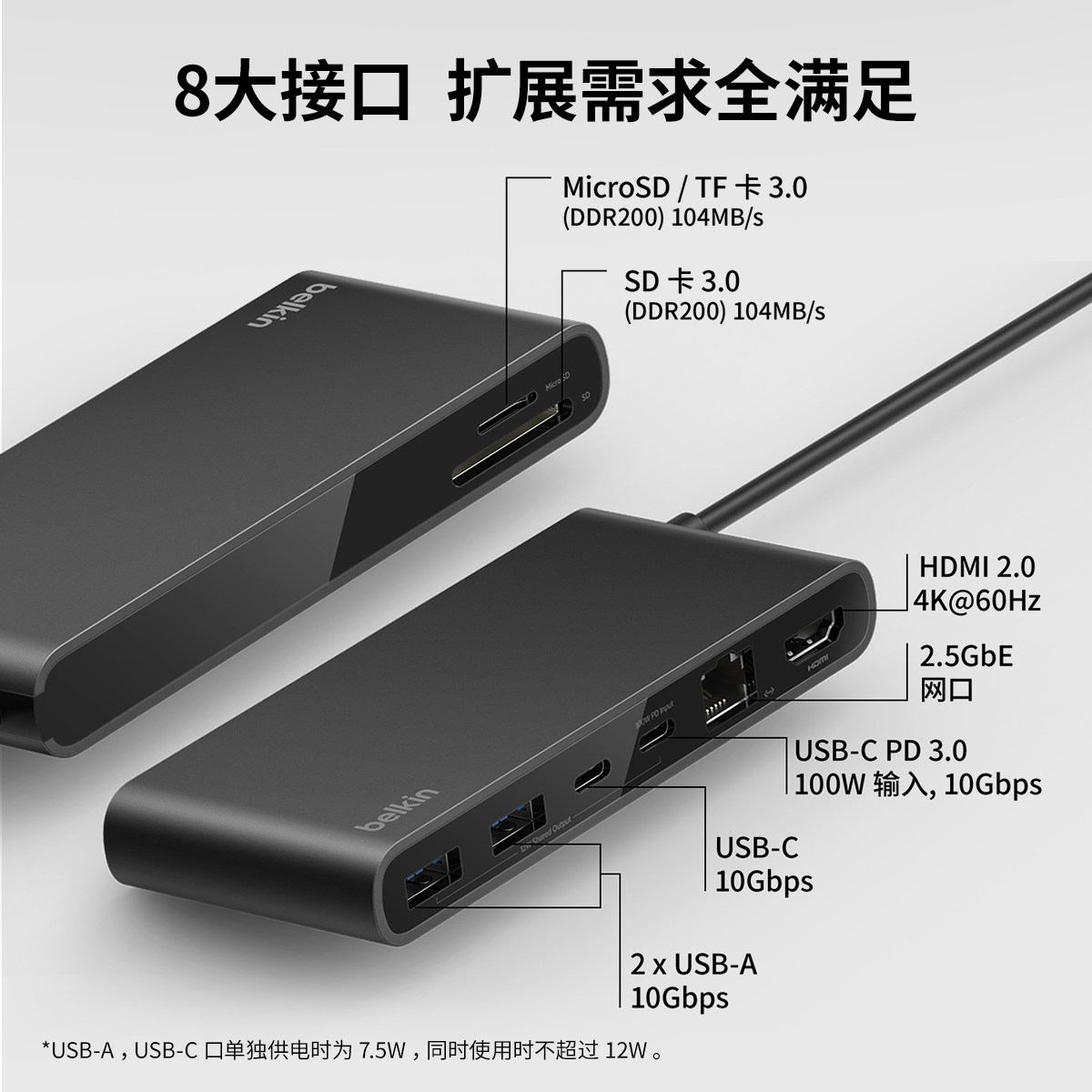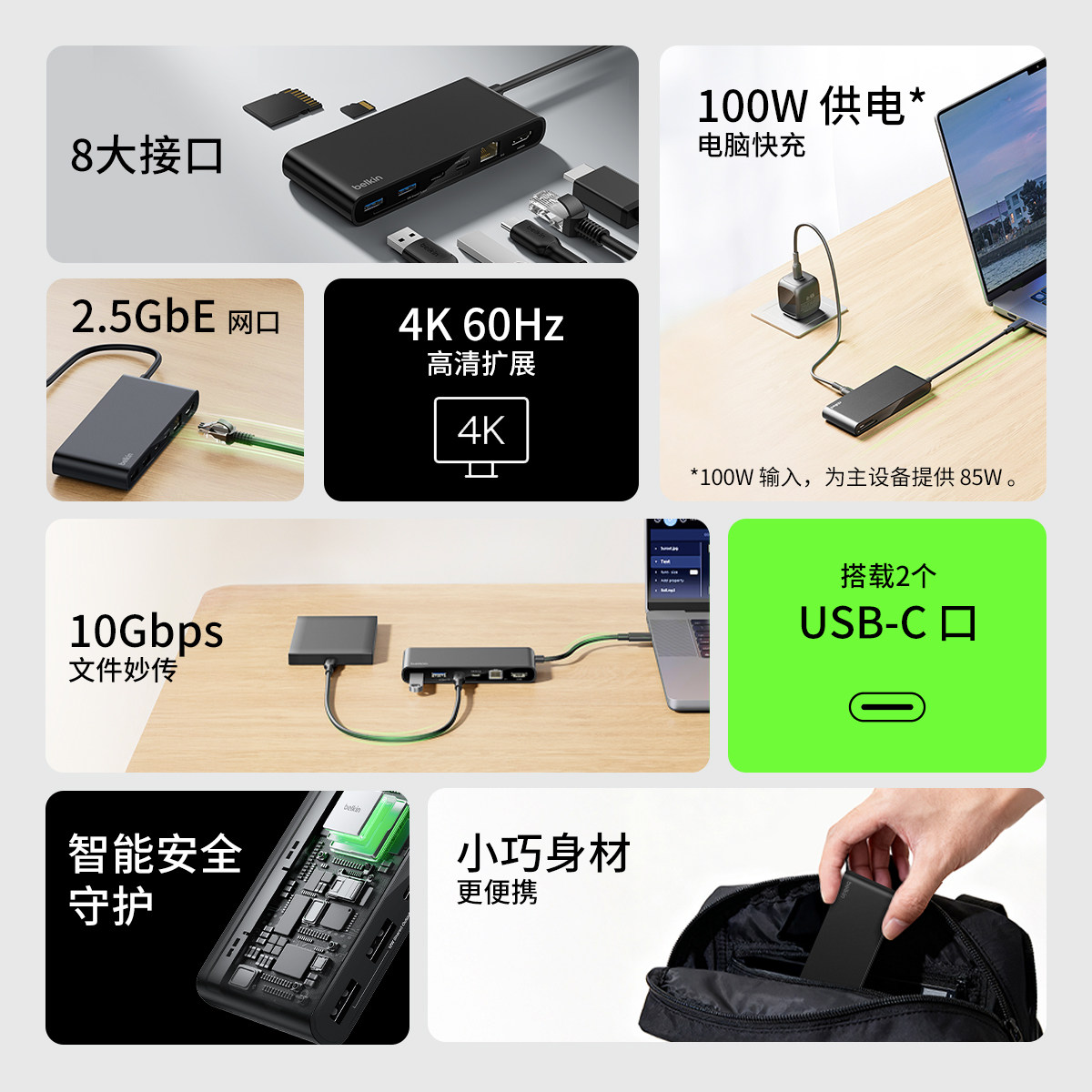 Belkin贝尔金typec多接口2.5G网口转接口扩展坞DP100W供电适用苹果Macbook笔记本电脑HDMI转换器便携拓展坞