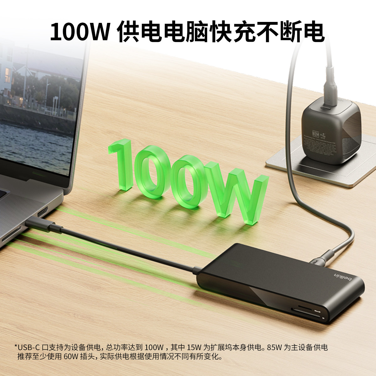 Belkin贝尔金五合一便携拓展坞100W供电USB-C适用苹果Mac笔记本电脑iPad转换器HDMI高清4K60Hz拓展10Gbps秒传