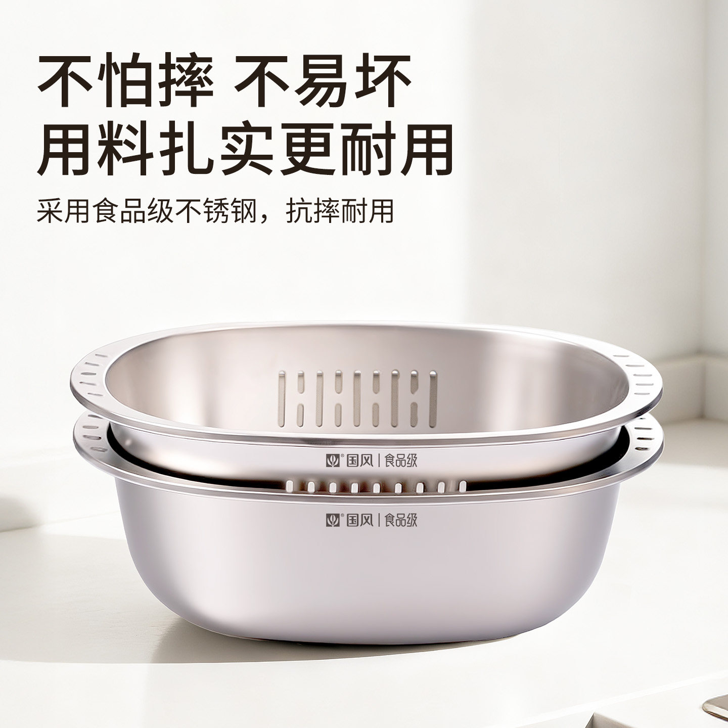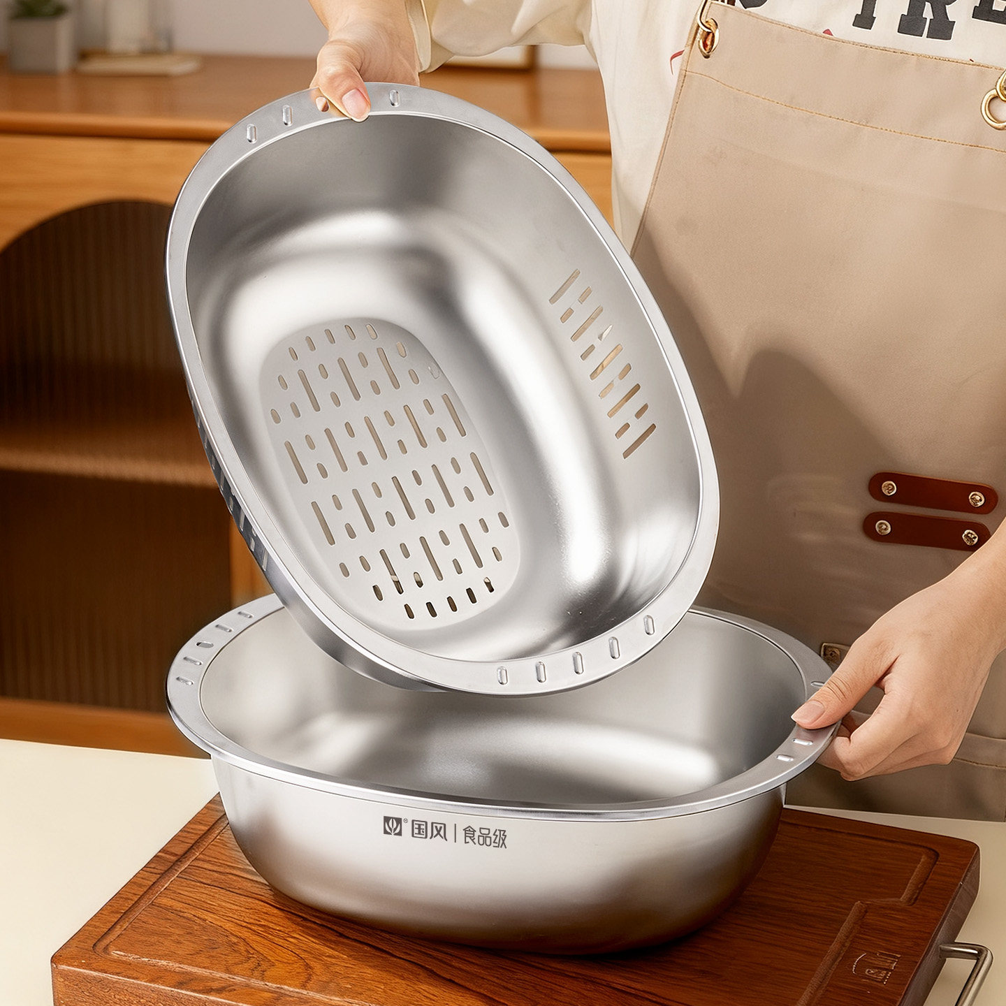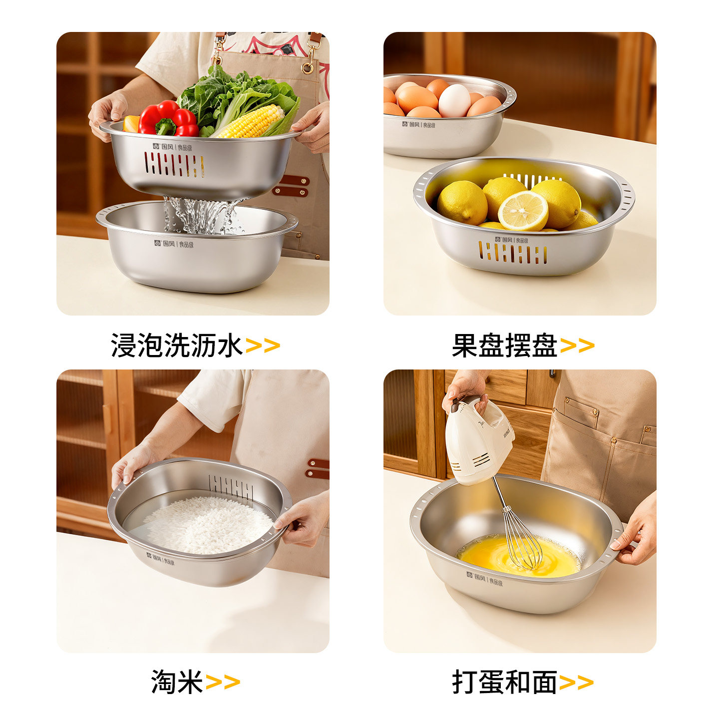 不锈钢盆洗菜盆沥水篮洗水果2025新款椭圆形盆厨房家用双层滤水篮