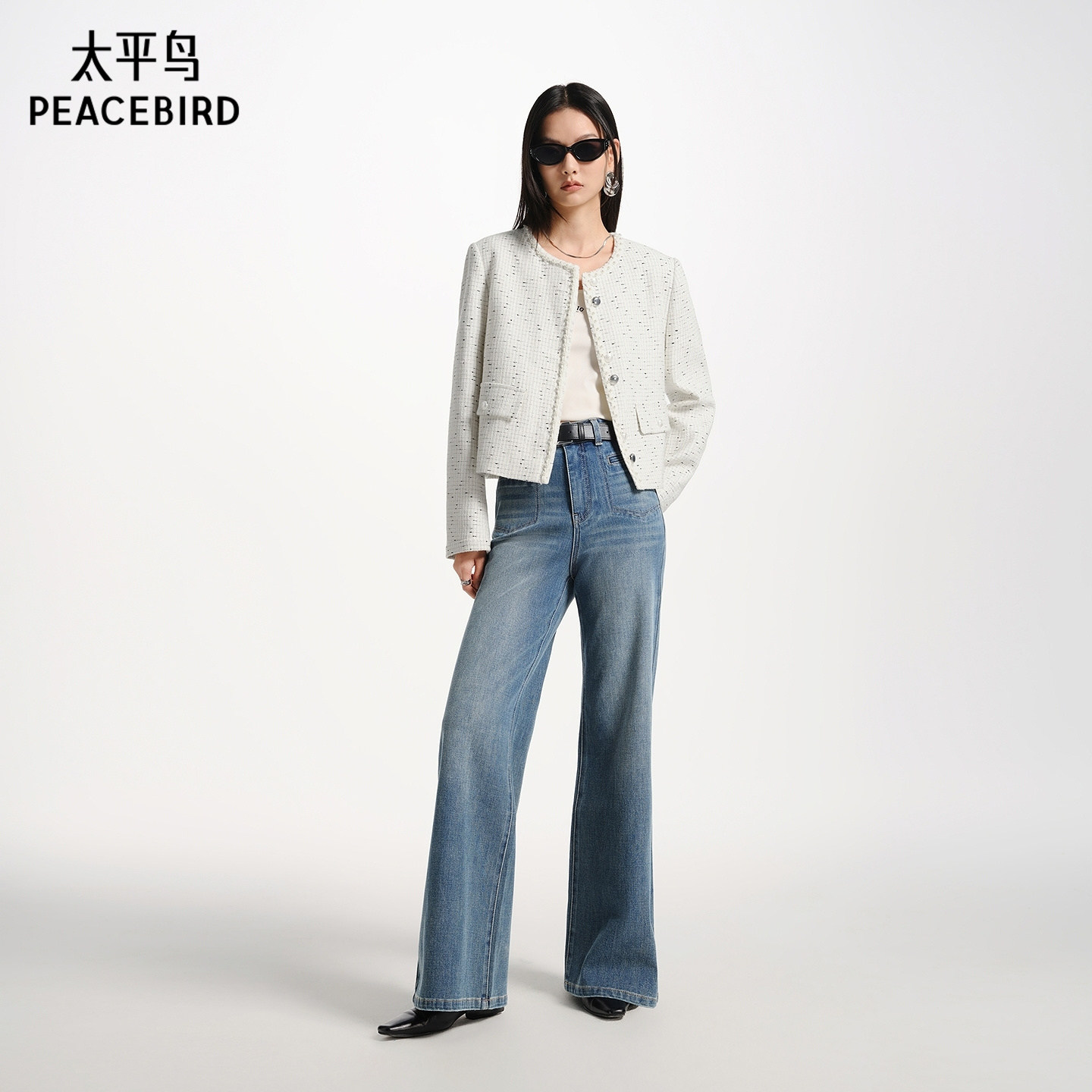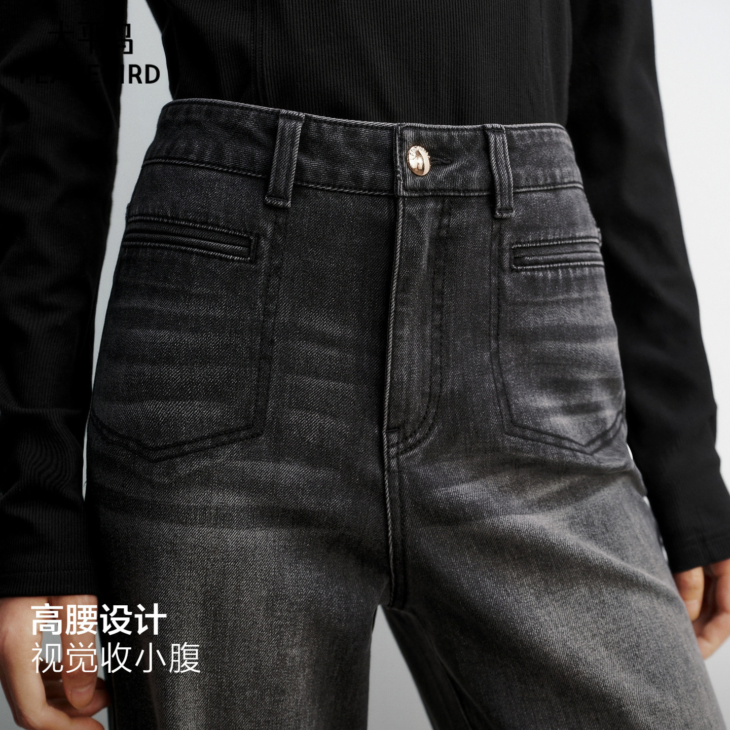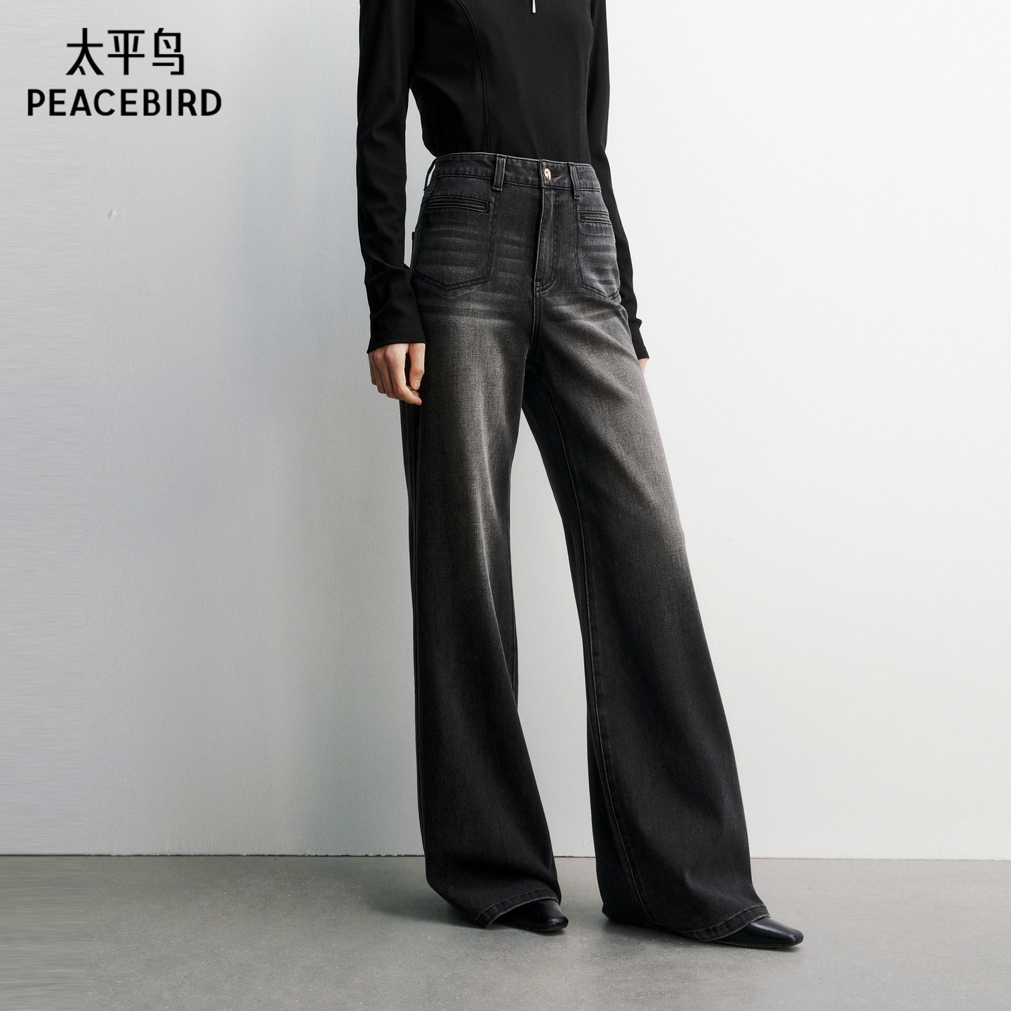 太平鸟高腰阔腿微喇裤26春款时髦水洗通勤四面弹修身喇叭牛仔裤女