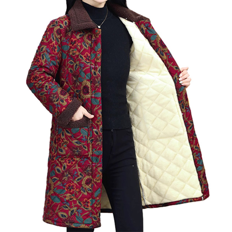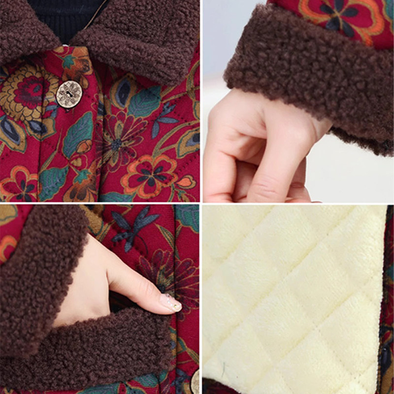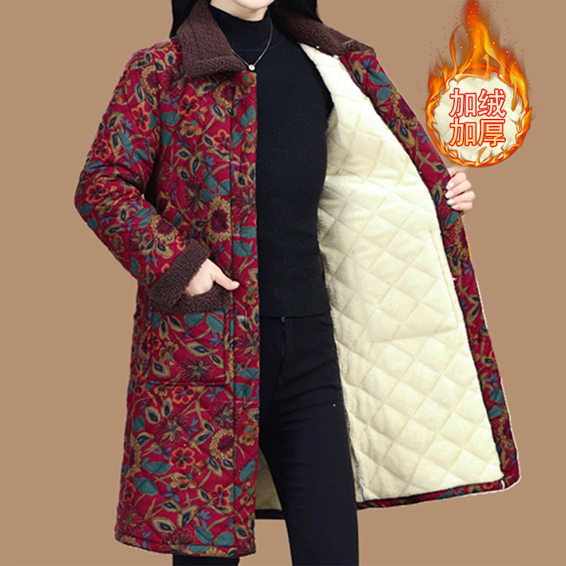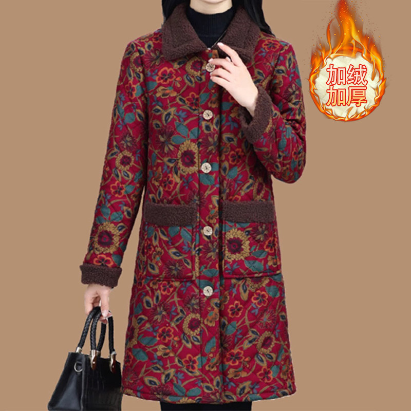 中老年人棉衣女加绒加厚妈妈装冬季新款中长款花棉袄奶奶外套加绒
