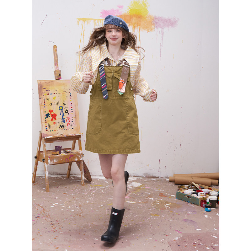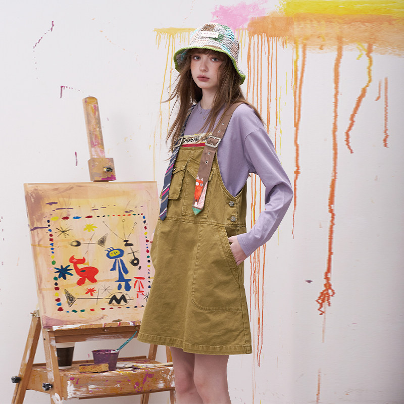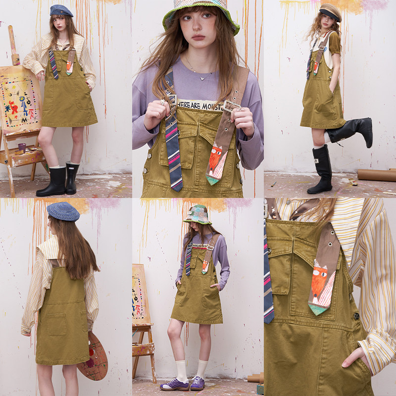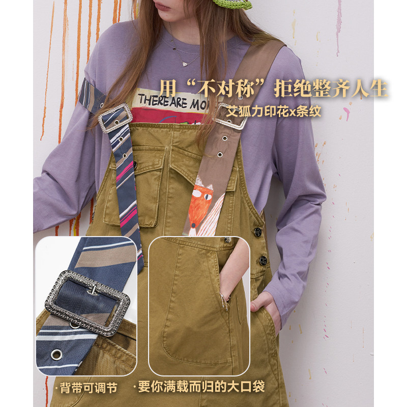 妖精的口袋趣味印花不对称肩带背带裙女2026春夏新款卡其色连衣裙