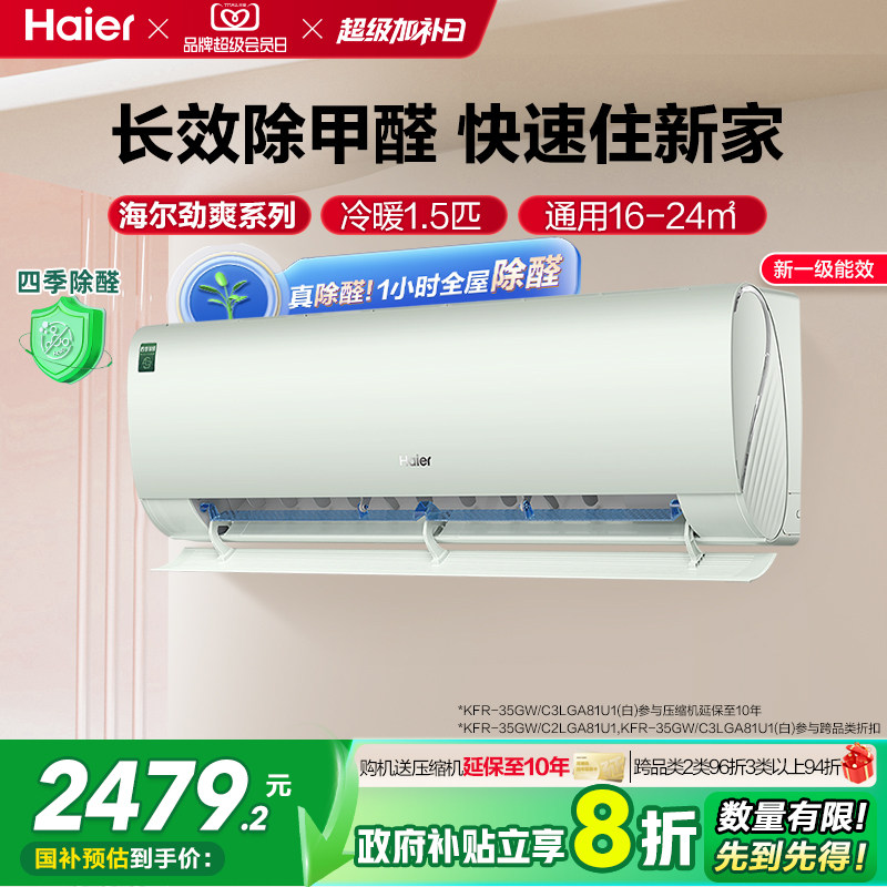 【除醛爆款】海尔空调劲爽家用官方1.5匹新一级变频冷暖挂机35LGA