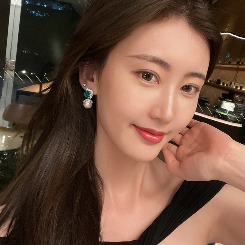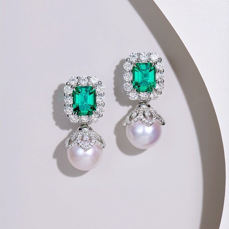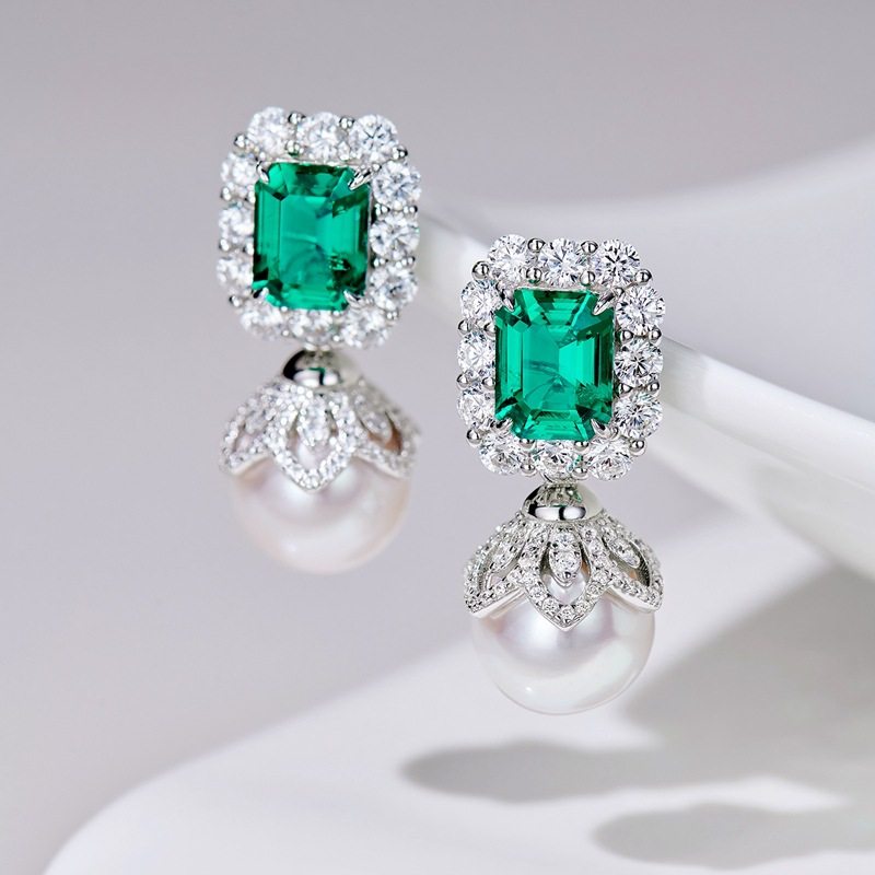 直播热卖新品仿真祖母绿碧玺珍珠满钻耳钉女名媛风公主方耳坠饰品
