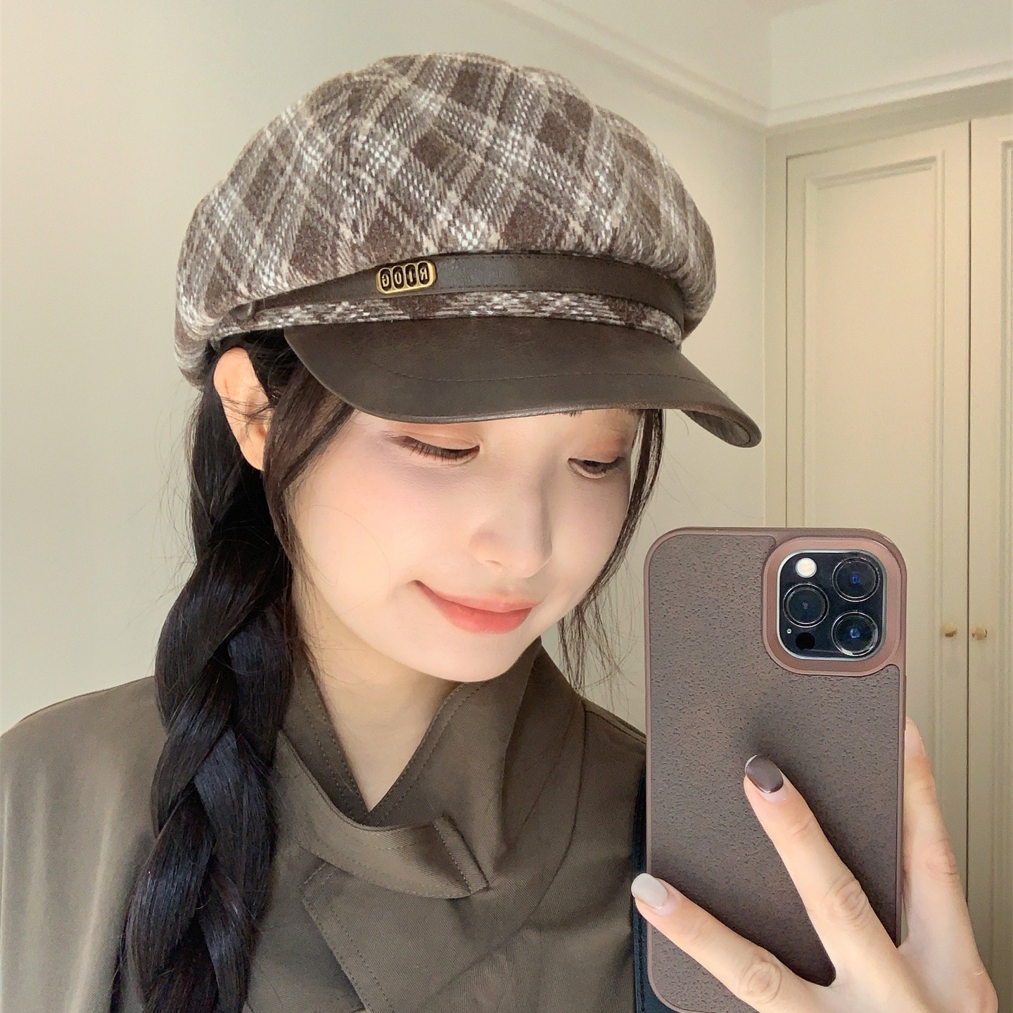 显脸小英伦风格纹毛呢八角帽黑复古反戴贝雷帽女报童帽子红色黑色