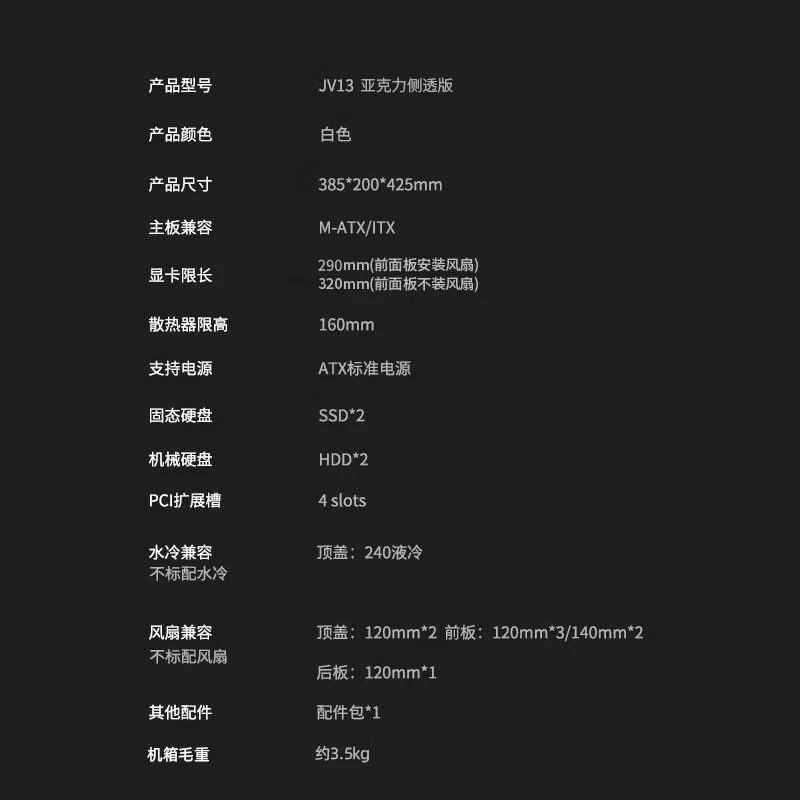 爱国者JV13机箱电脑台式主机itx白色高颜值matx水冷机箱侧透明diy