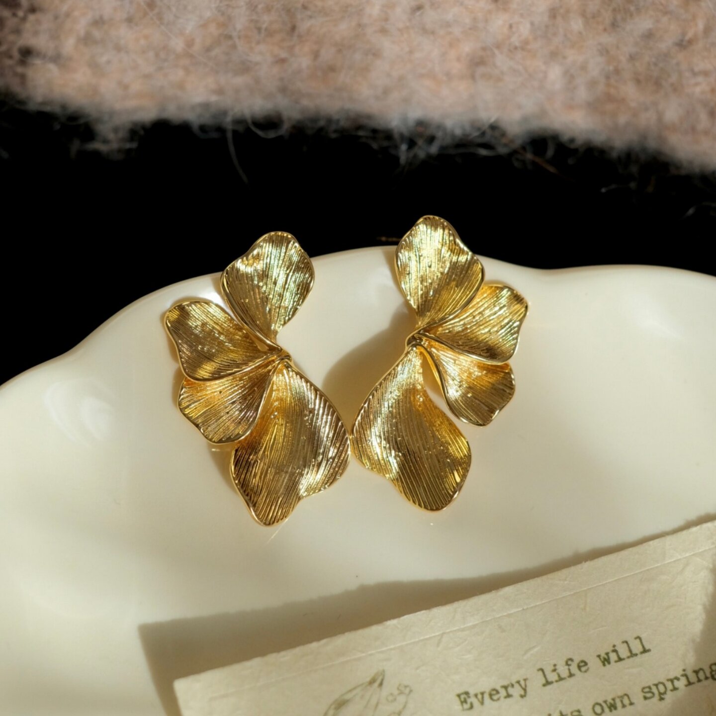 《吹皱花瓣》小众独特复古仙气金色拉丝纹理花朵耳饰耳环耳钉耳夹
