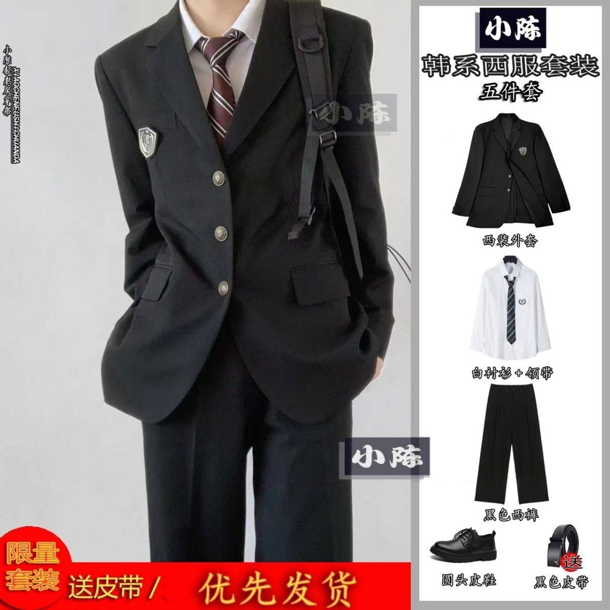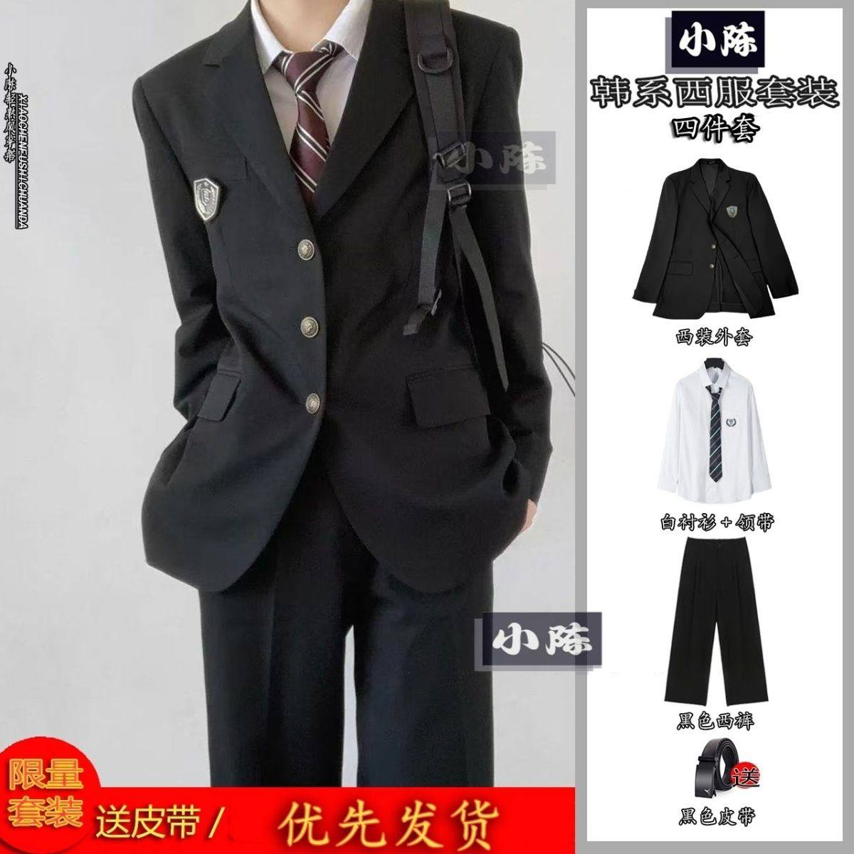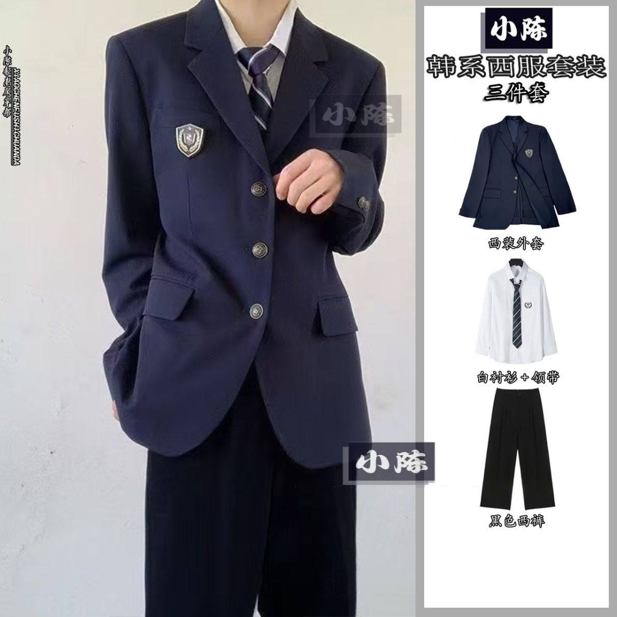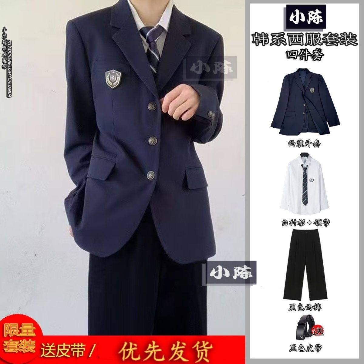日系学院风dk制服西服套装宽松痞帅春秋季jk学生班服徽章西服蓝色