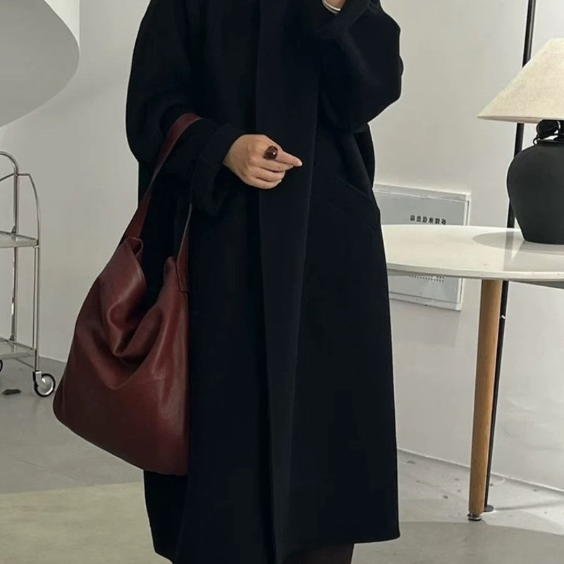 赫本风立领超长款双面呢黑色大衣女高端气质宽松高个子羊毛呢外套