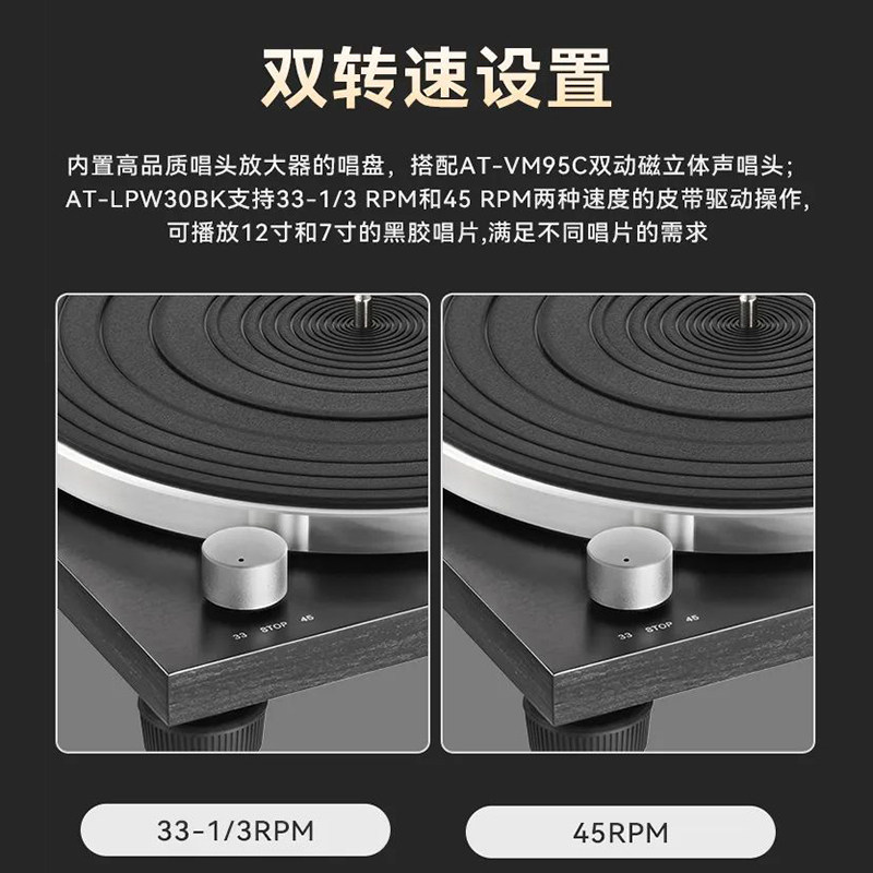 铁三角AT-LPW30BK手动皮带黑胶唱机留声机复古唱片机唱盘机电唱机