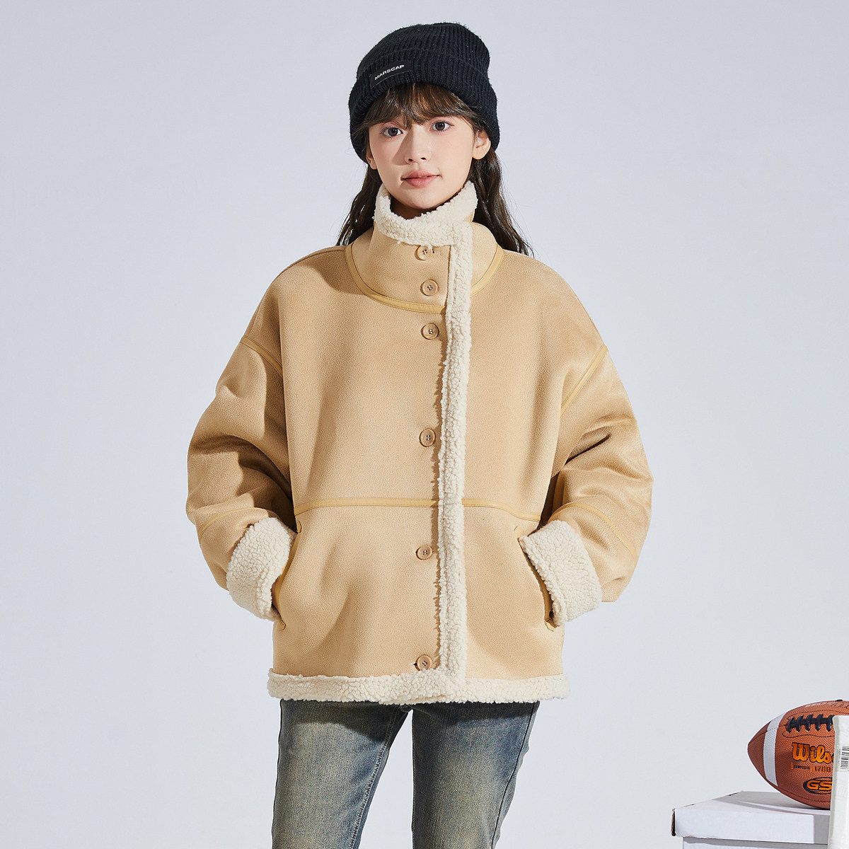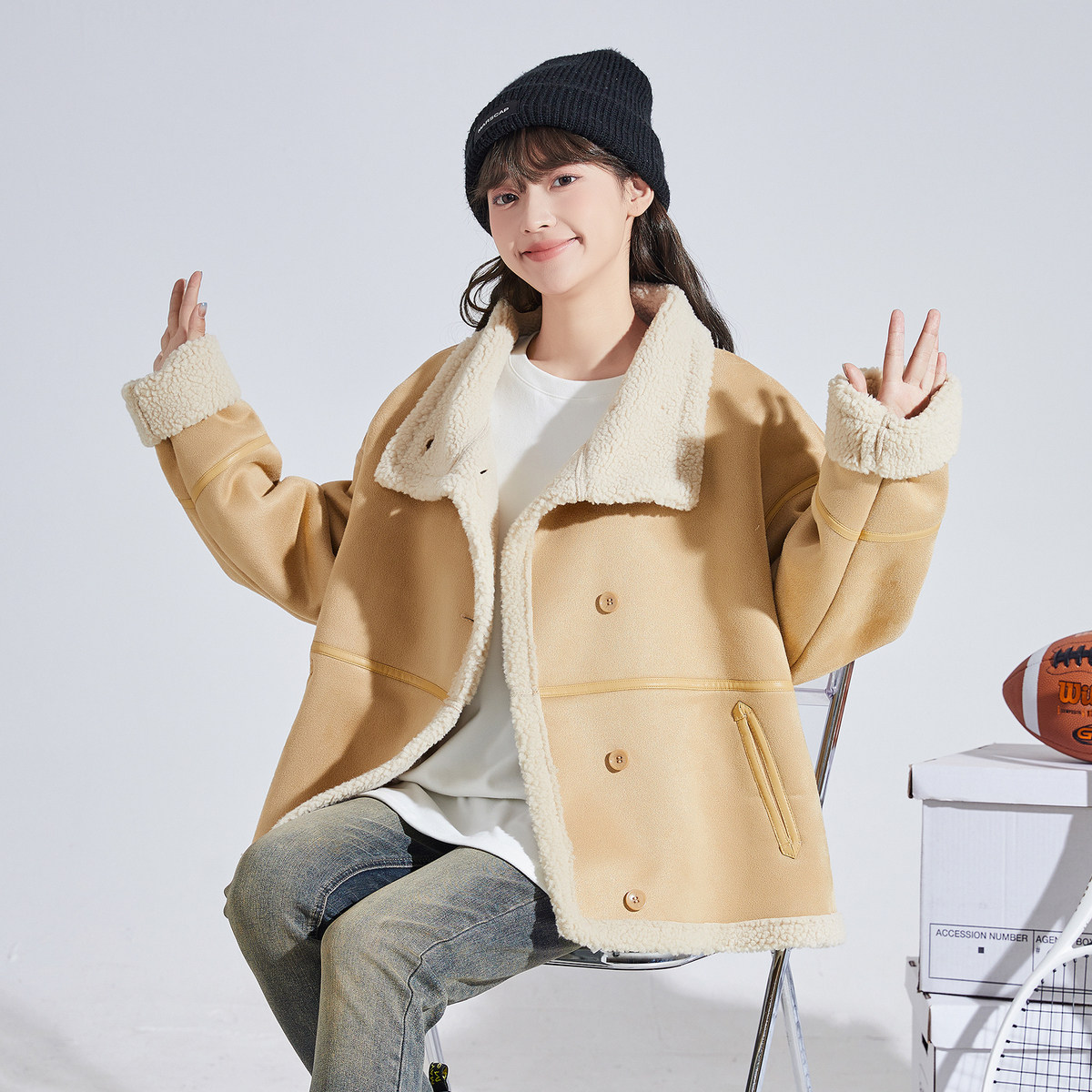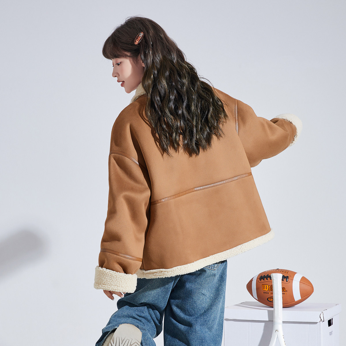 唐狮秋冬季新款外套女立领撞色仿麂皮绒拼接仿羔绒短款外套流行tu