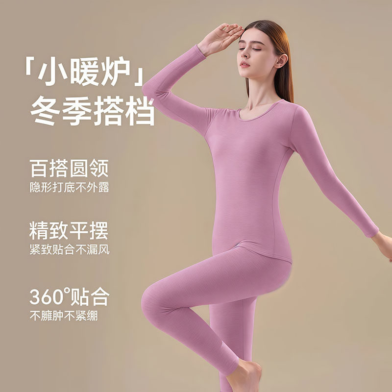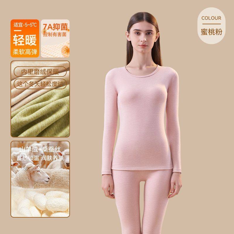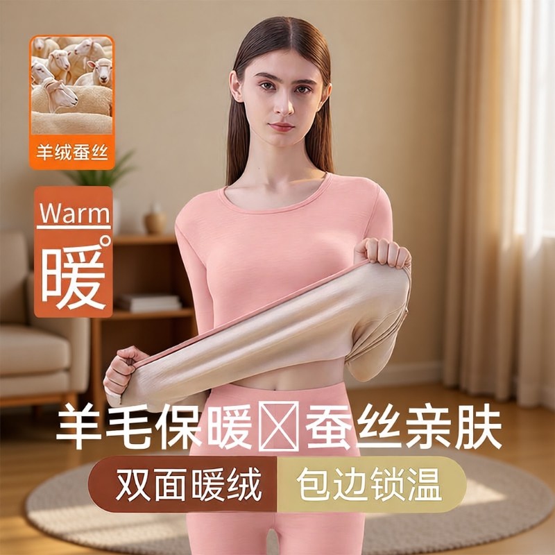无痕保暖内衣套装女士秋冬季加绒羊毛蚕丝圆领打底速暖秋衣秋裤女