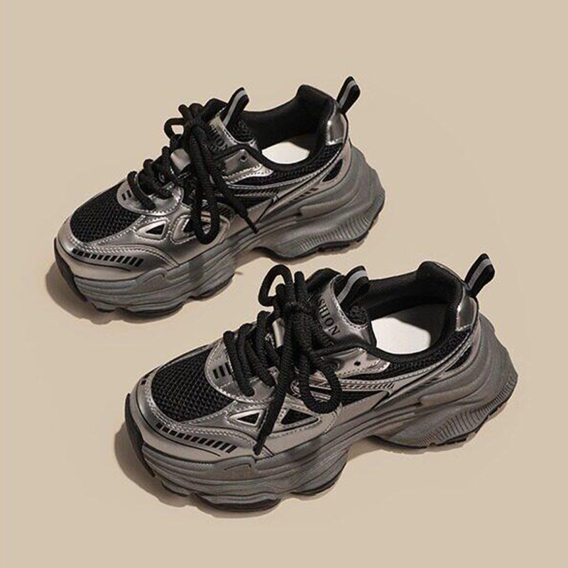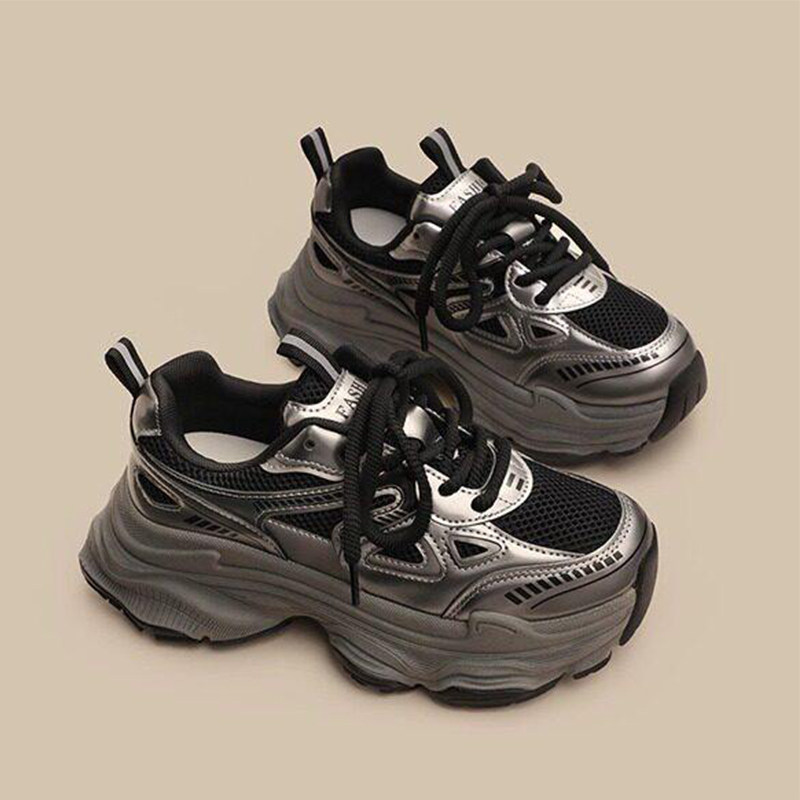 厚底老爹鞋女2025女款新款秋冬保暖加绒女鞋银色内增高休闲运动鞋