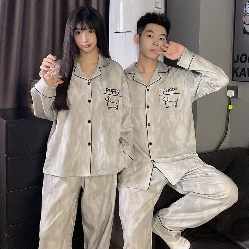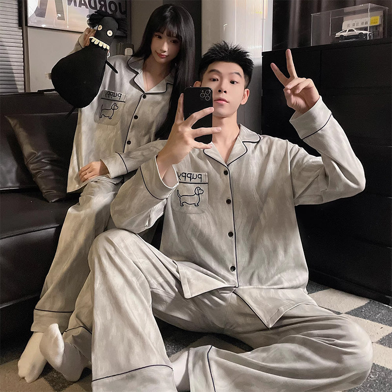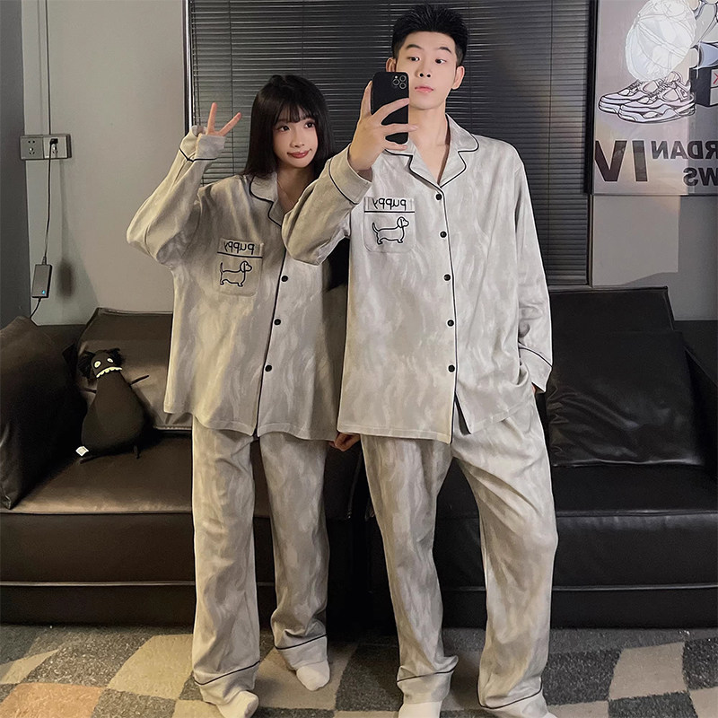 安比斯情侣睡衣舒适纯棉秋季女长袖男女同款休闲家居服套装可出门
