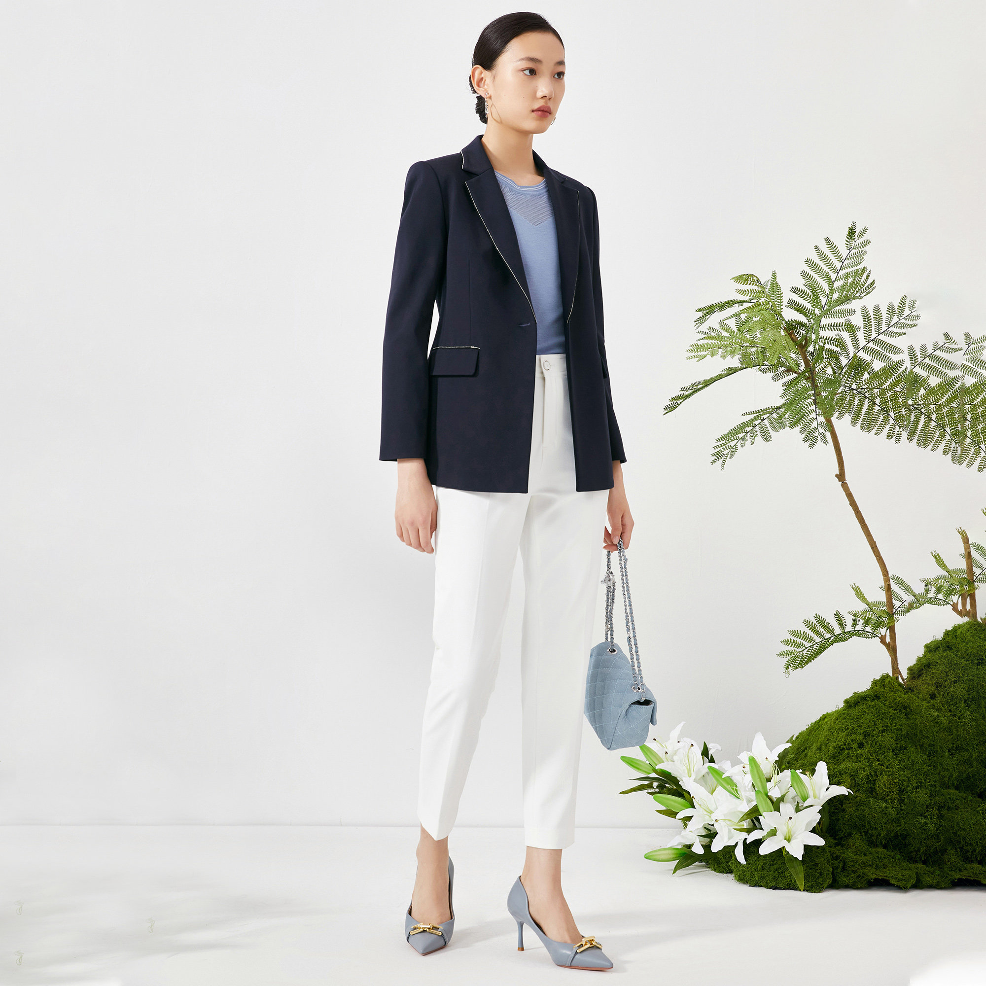 COCOBELLA高智感拼接人丝无领西装女早秋通勤休闲气质外套SI533B