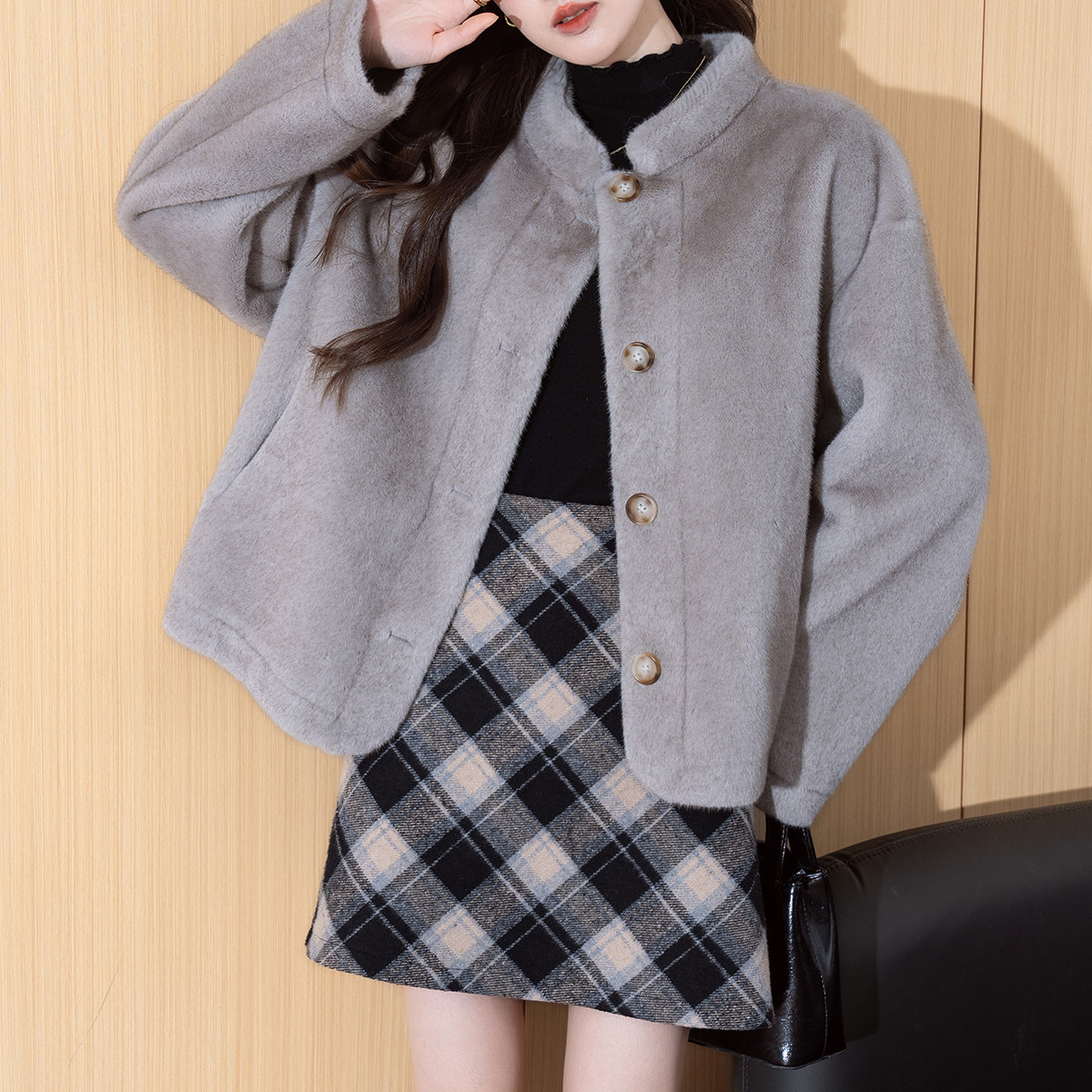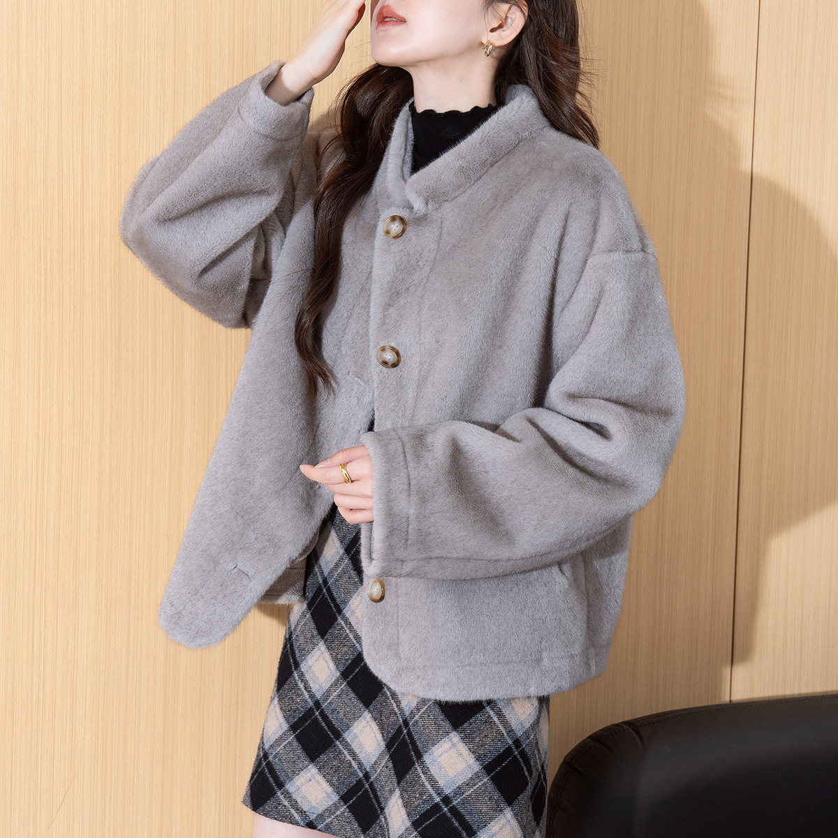 唐狮秋冬新款短款毛绒仿皮草外套女士时尚慵懒小香风好看夹克TD