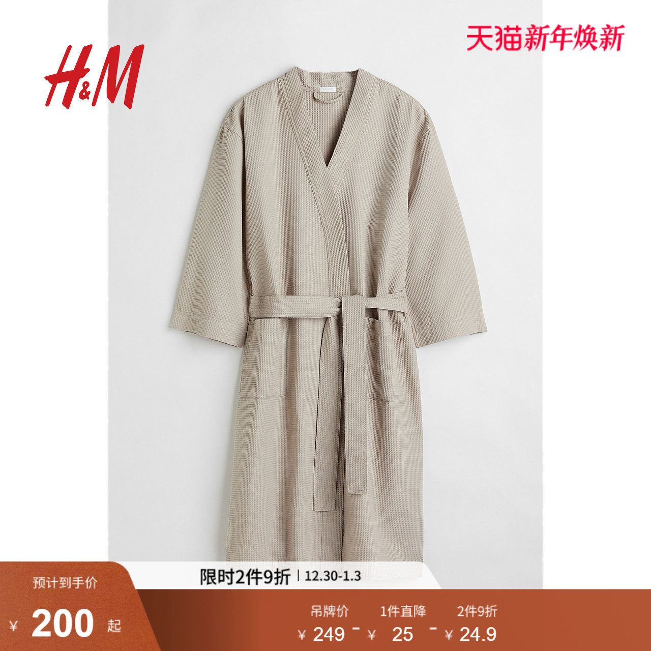 HM女士家居服睡袍四季柔软华夫格有口袋绑带浴袍睡袍0991755