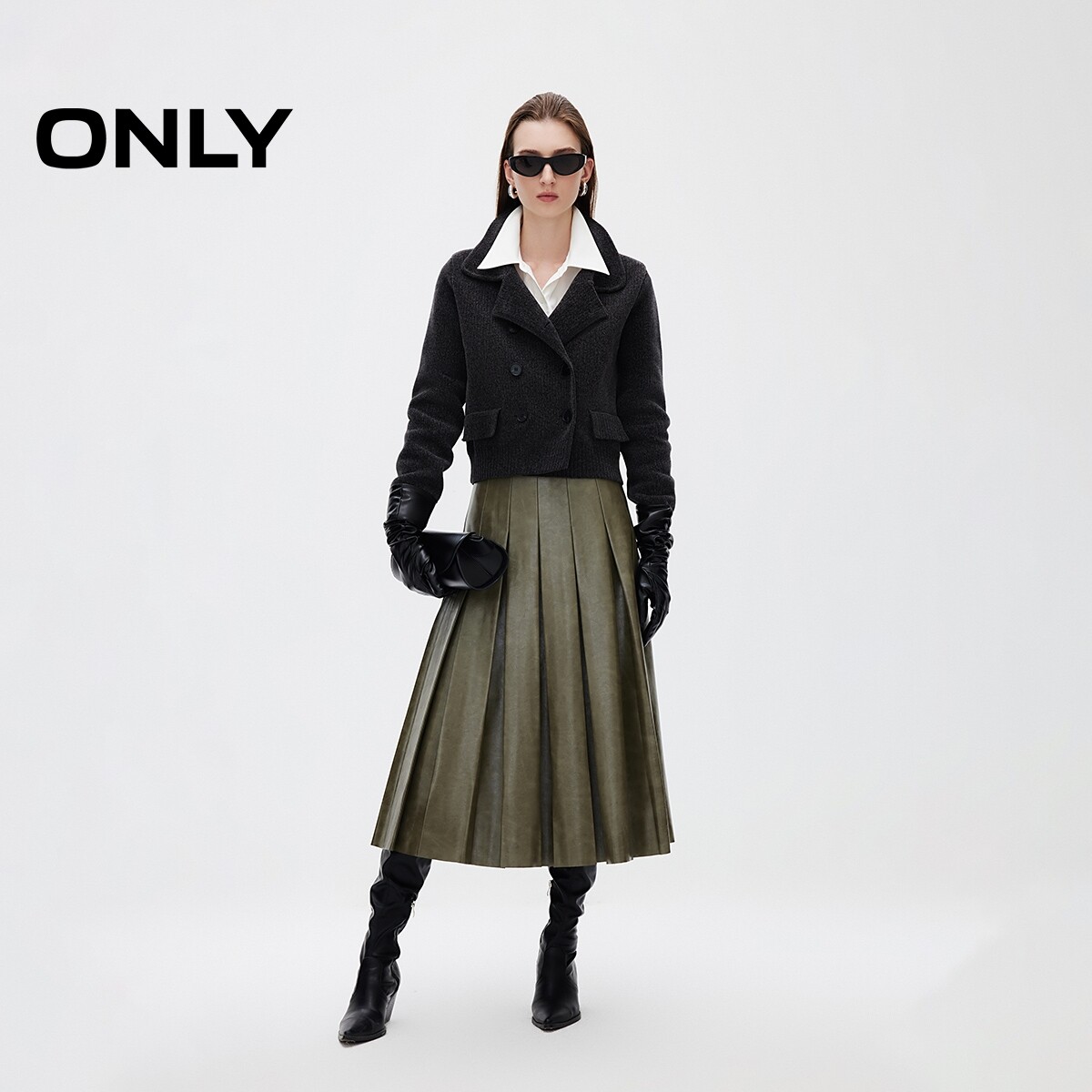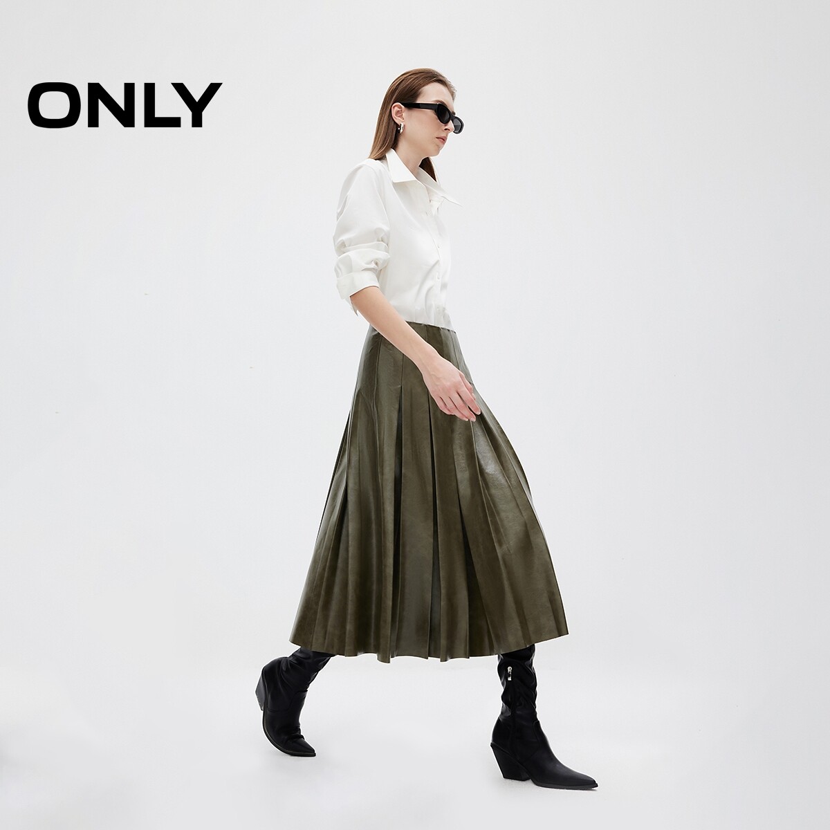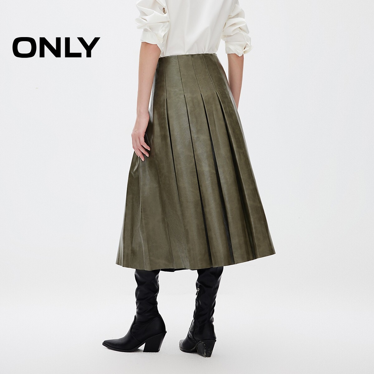 【ONLY奥莱】春季新款简约时尚高腰PU百褶裙中长裙半身裙女