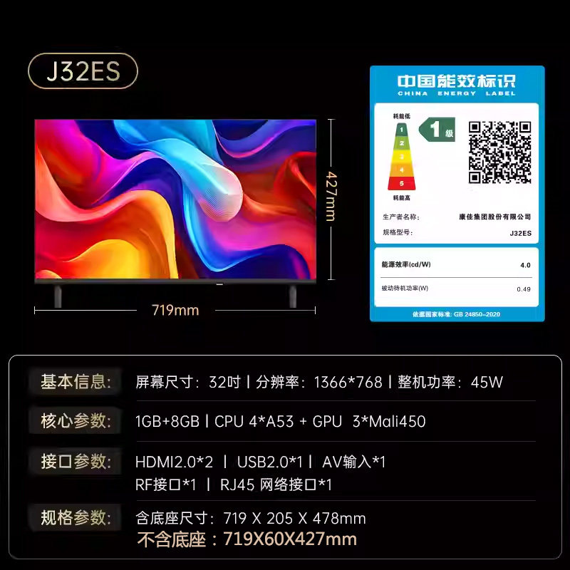 康佳J32ES 32英寸一级能效全面屏网络高清智能语音液晶平板电视机