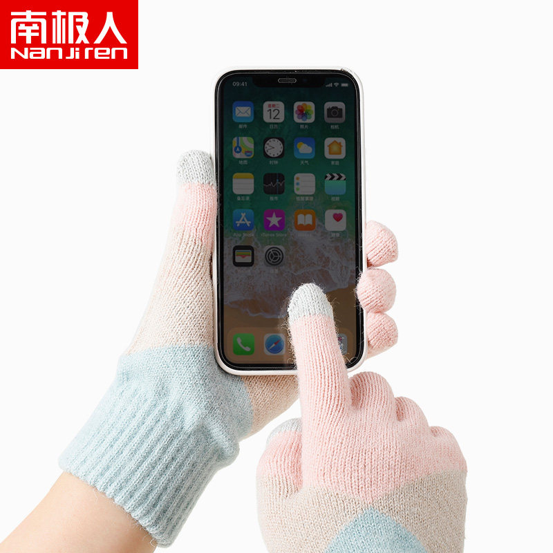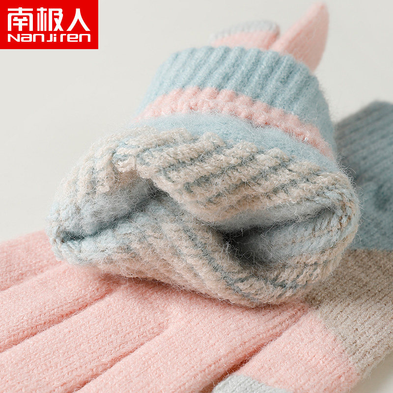 南极人秋冬天毛线手套女加厚加绒针织格子保暖冬季骑行防寒触屏H