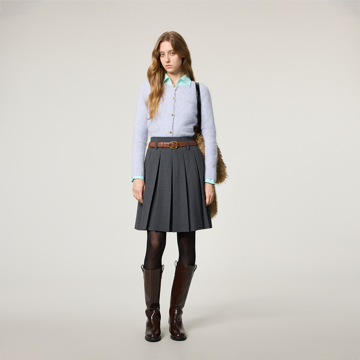 COCOBELLA花纱毛衣女秋冬灰色上衣休闲长绒针织衫外套MZ3218