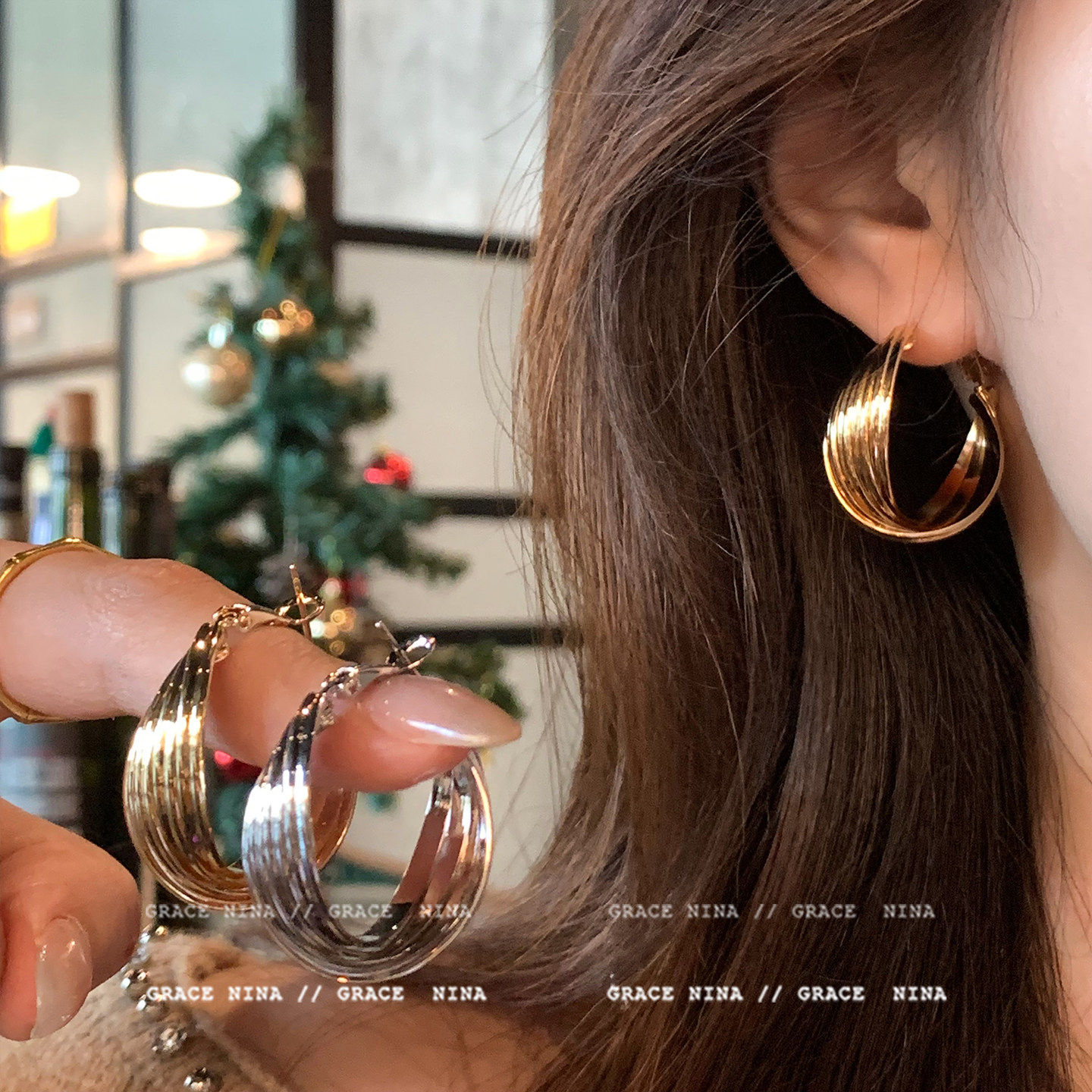银色素圈大耳圈女款2025新款爆款圆圈耳环轻奢高级方圆脸圈圈耳饰