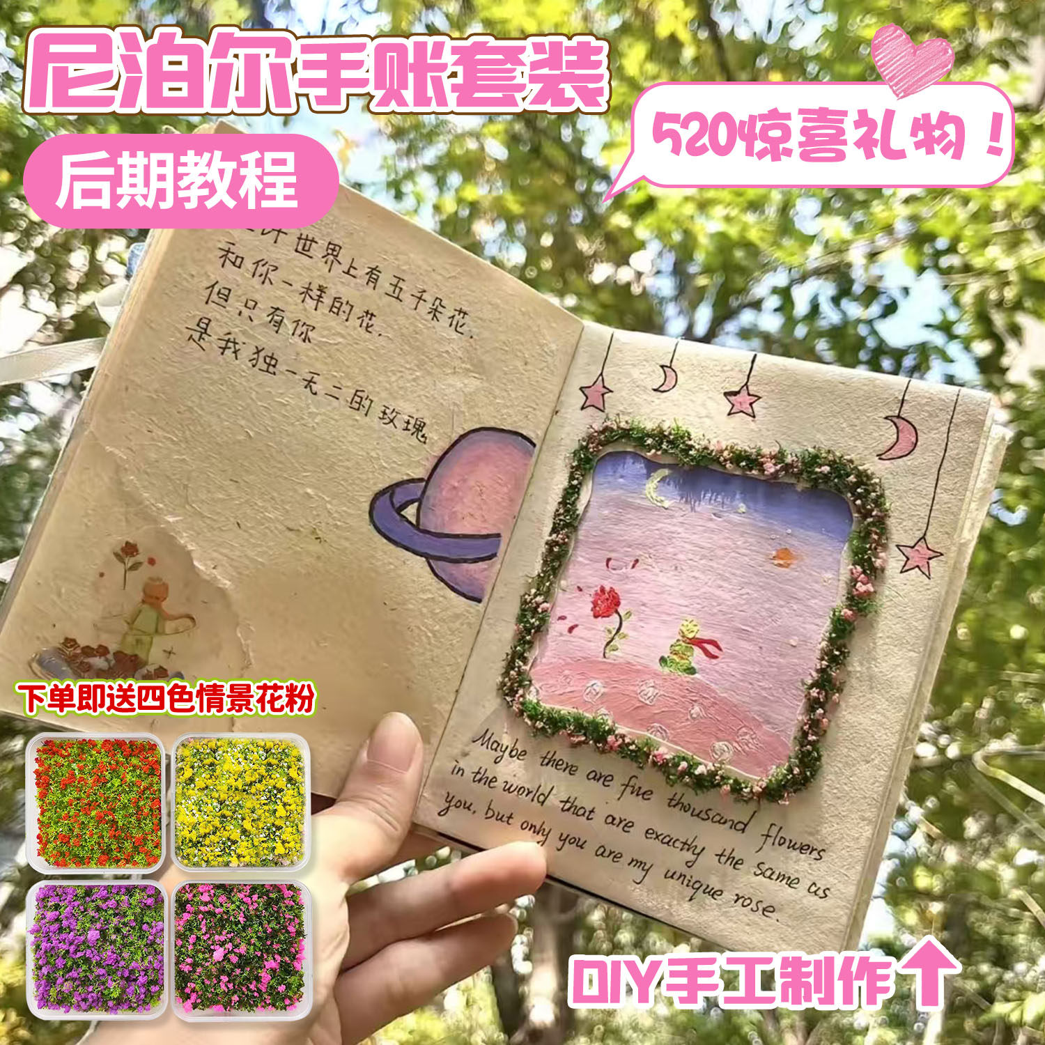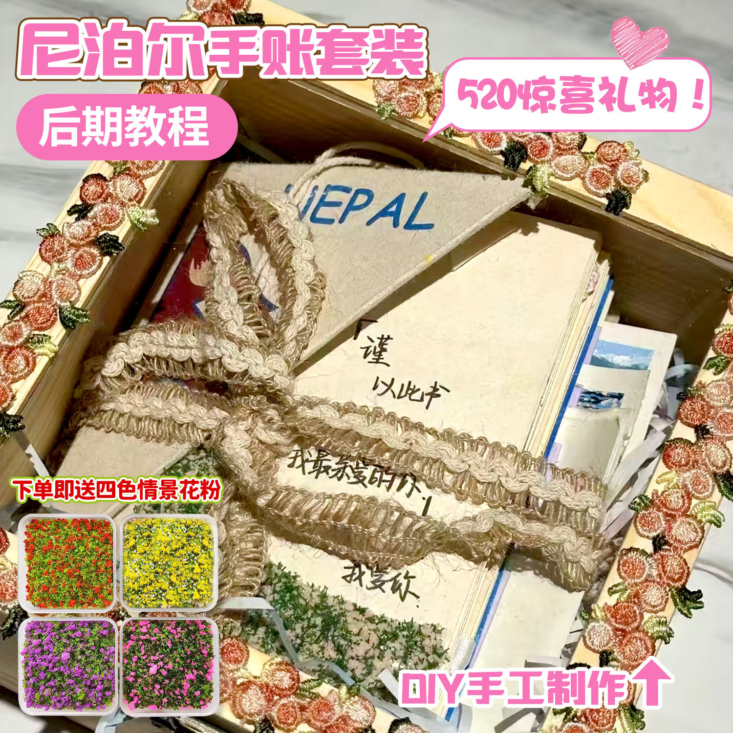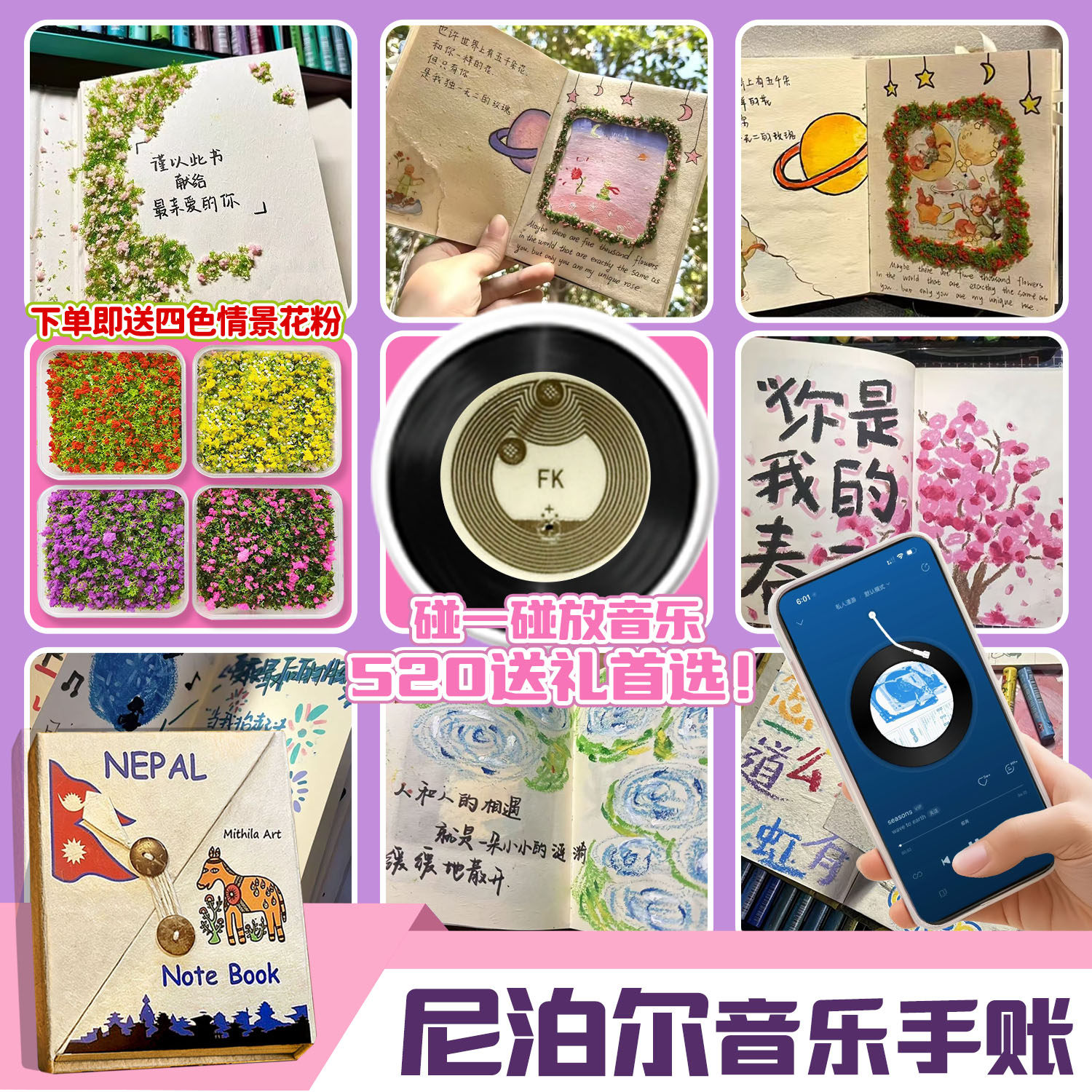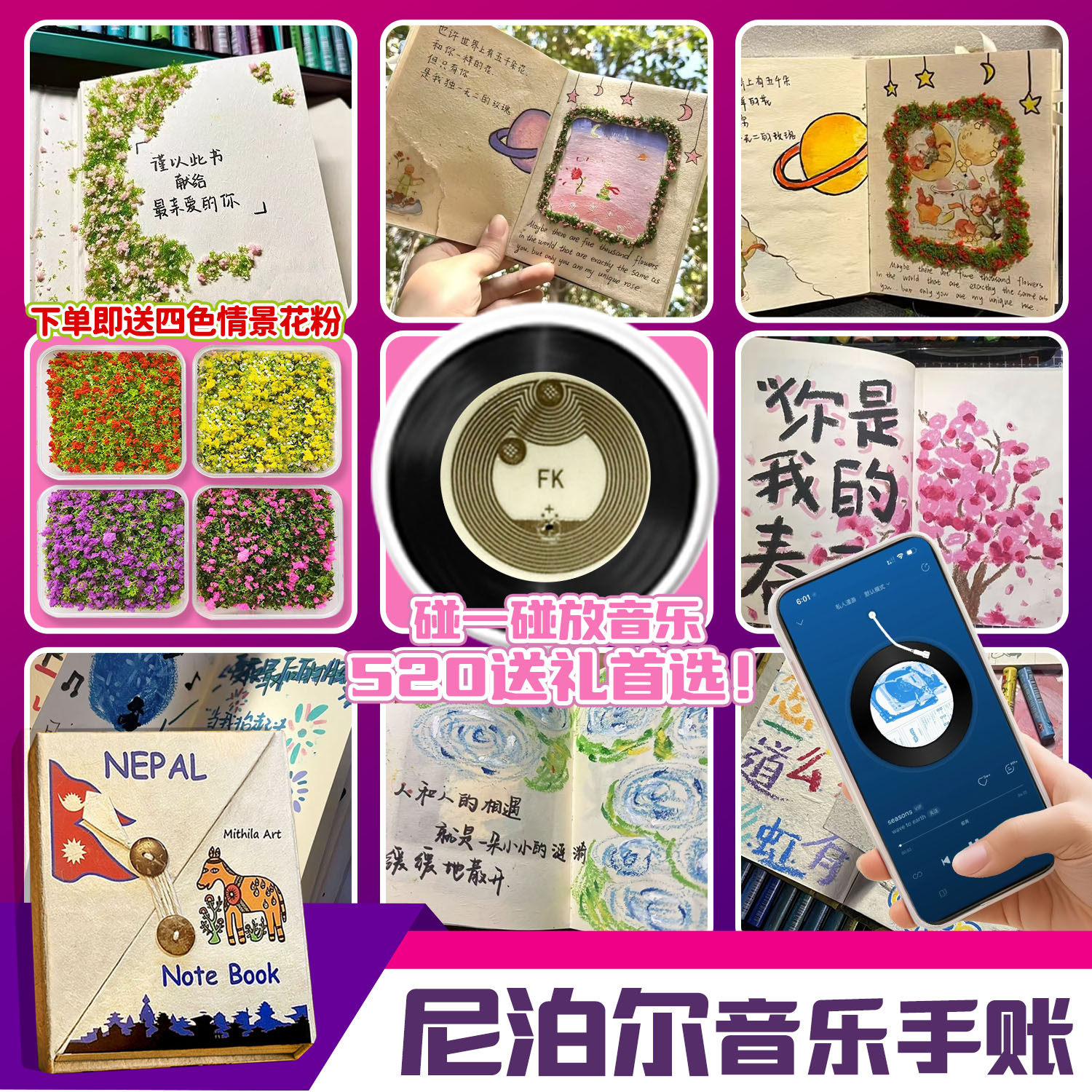 尼泊尔手工本花粉NFC音乐材料包复古艺术杂志仿真花草场送男友