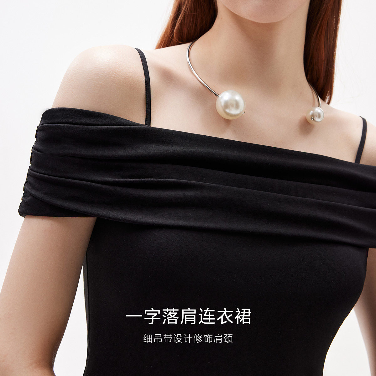 ONLY夏季拼接纯色小黑裙一字肩收腰花苞裙短裙连衣裙女