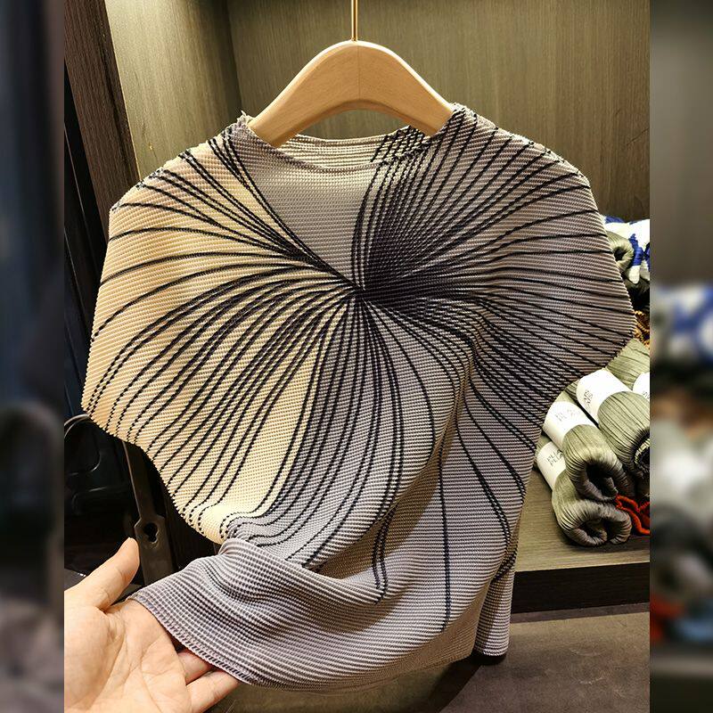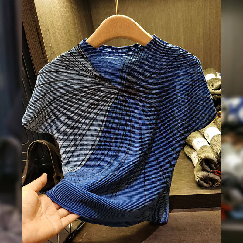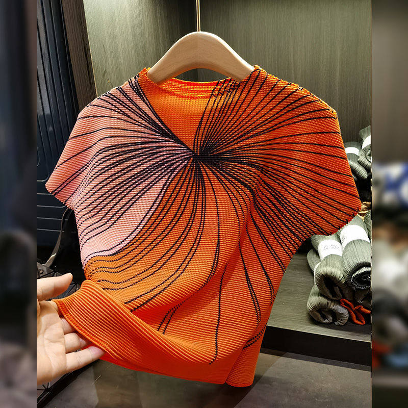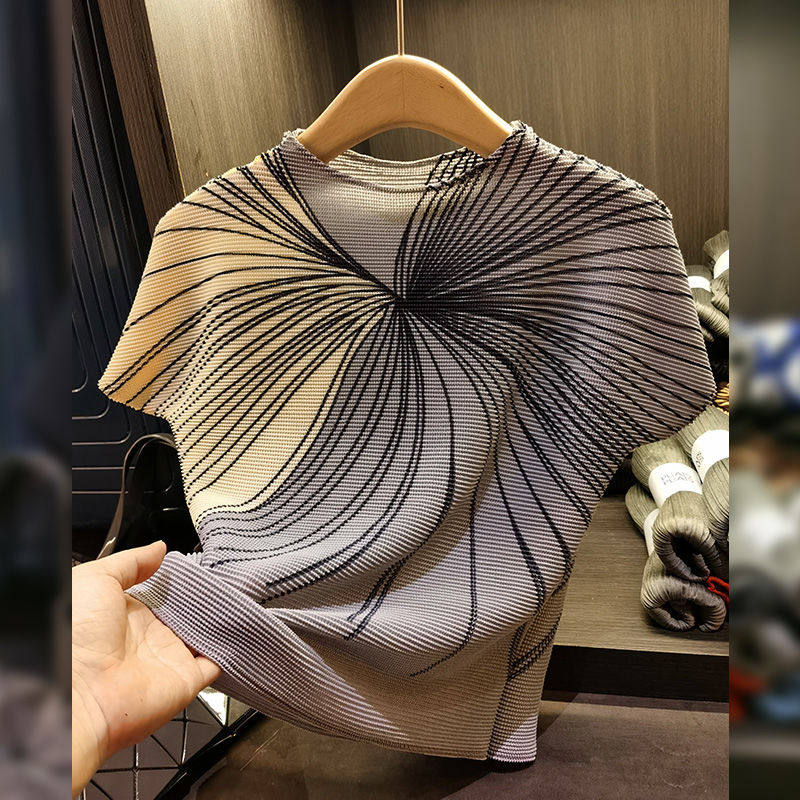 休闲褶皱上衣气质印花短袖压褶T恤百搭显瘦新款修身显瘦百搭上衣
