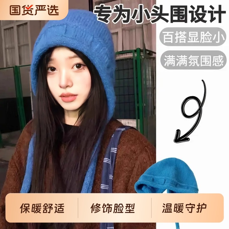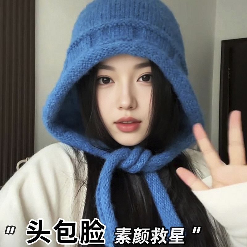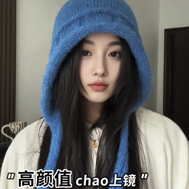 蓝色针织毛线帽子女款2025新款秋冬保暖护耳大头围韩系红色显脸小
