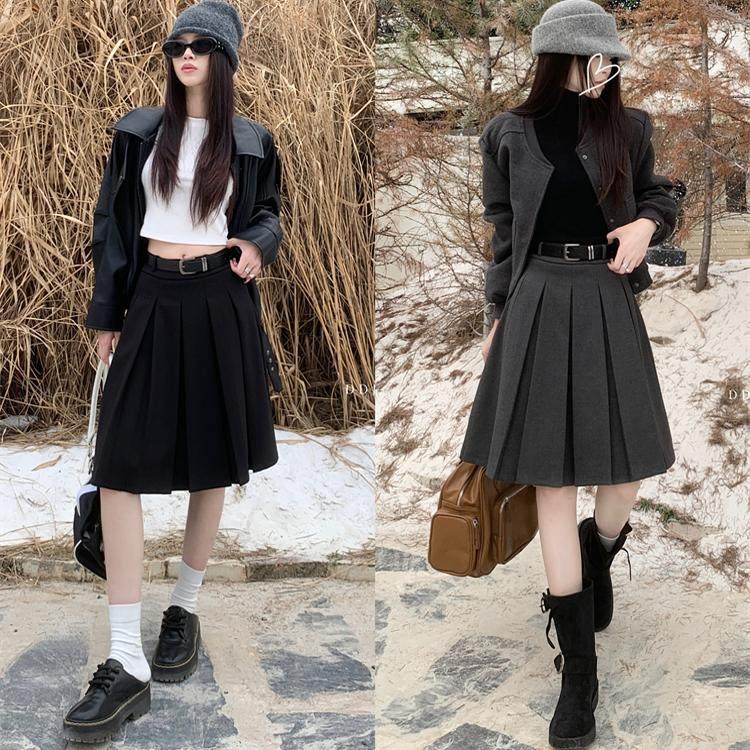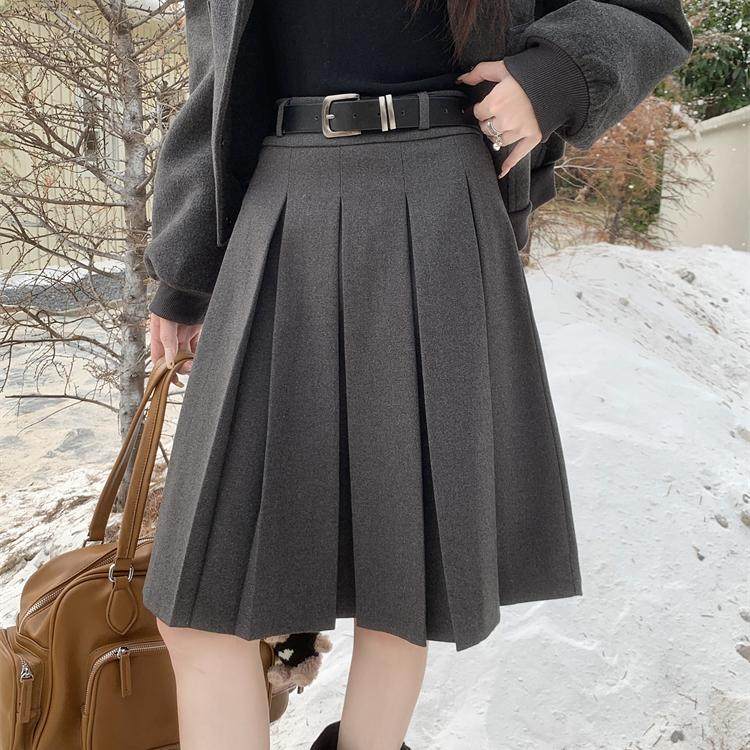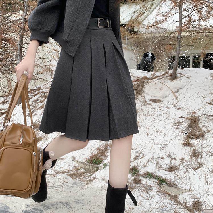 大码高腰灰色毛呢百褶裙女士中长款秋冬a字半裙学院风遮胯半身裙