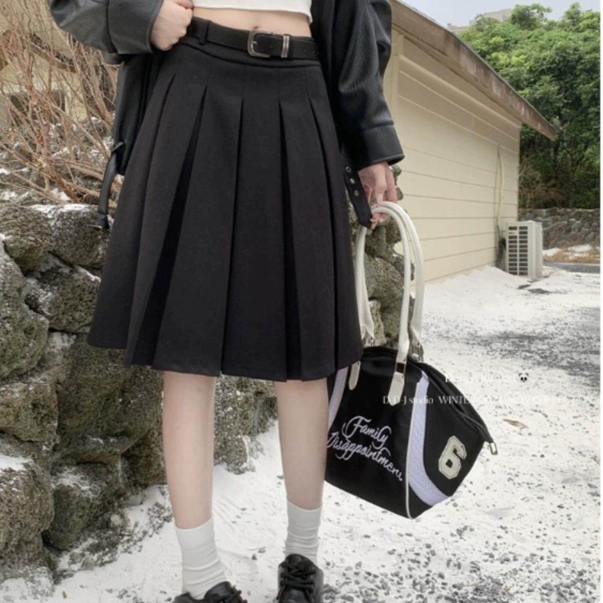 MJ STYLE灰色百褶西装裙女秋冬半身裙高腰休闲大摆a字过膝中长裙