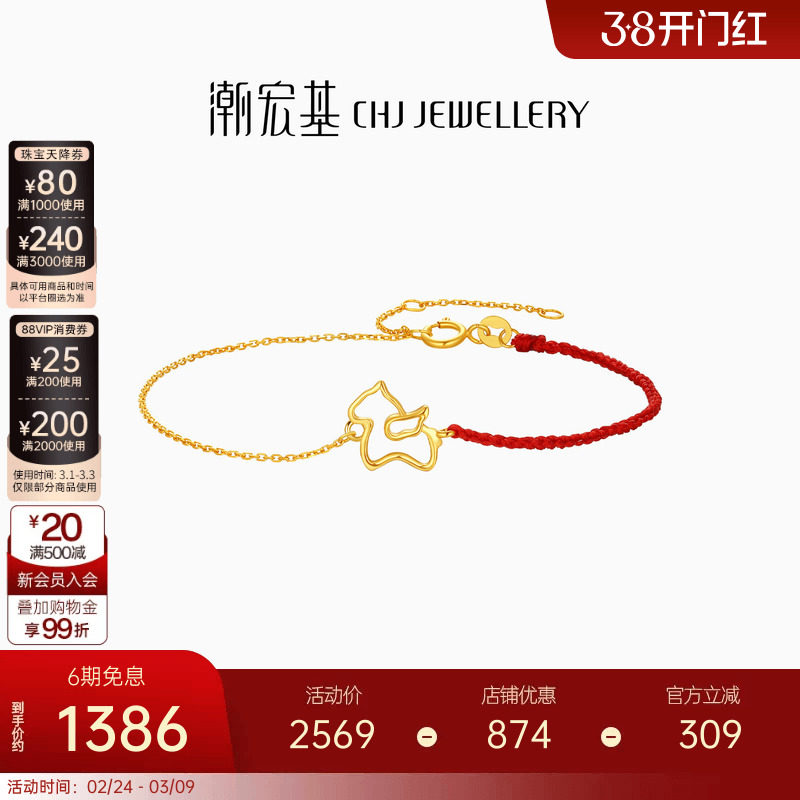 潮宏基至简爆闪碎冰冰黄18k金手链本命年骐骥红绳叠戴新年礼物女