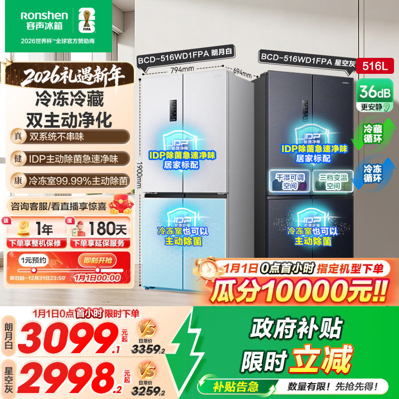 【526十字款】容声516L双净双系统十字双开四门家用无霜嵌入冰箱