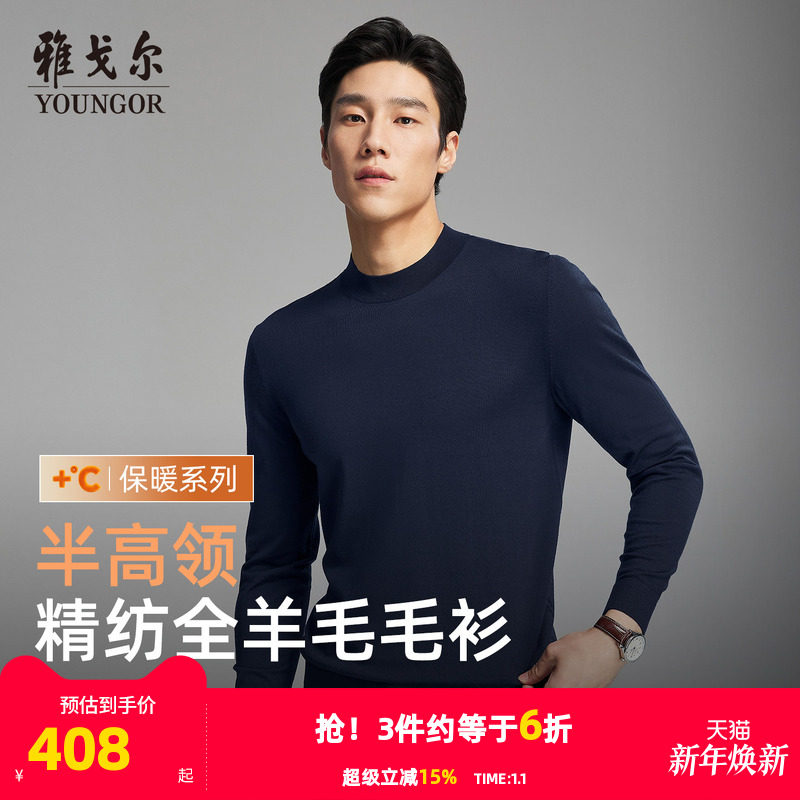 【全羊毛】雅戈尔秋冬季男士半高领毛衫纯色打底商务休闲保暖毛衣