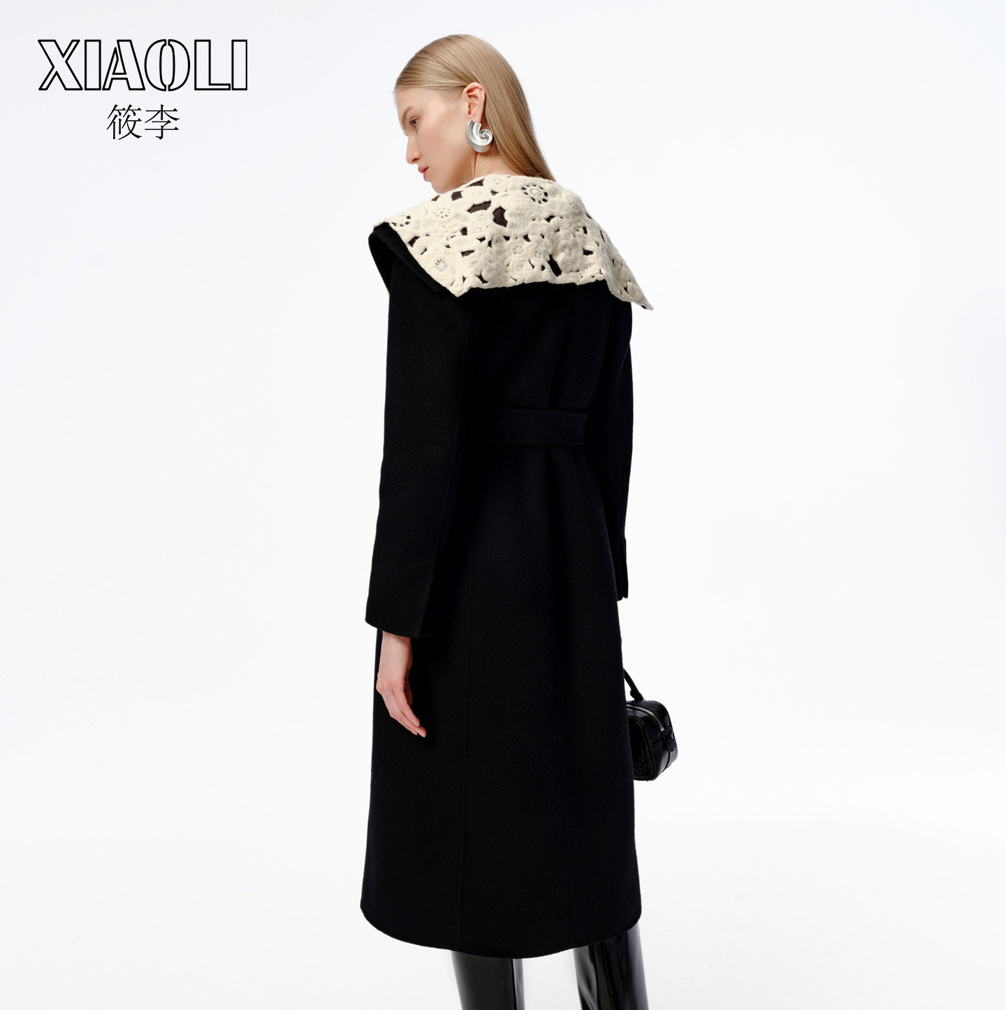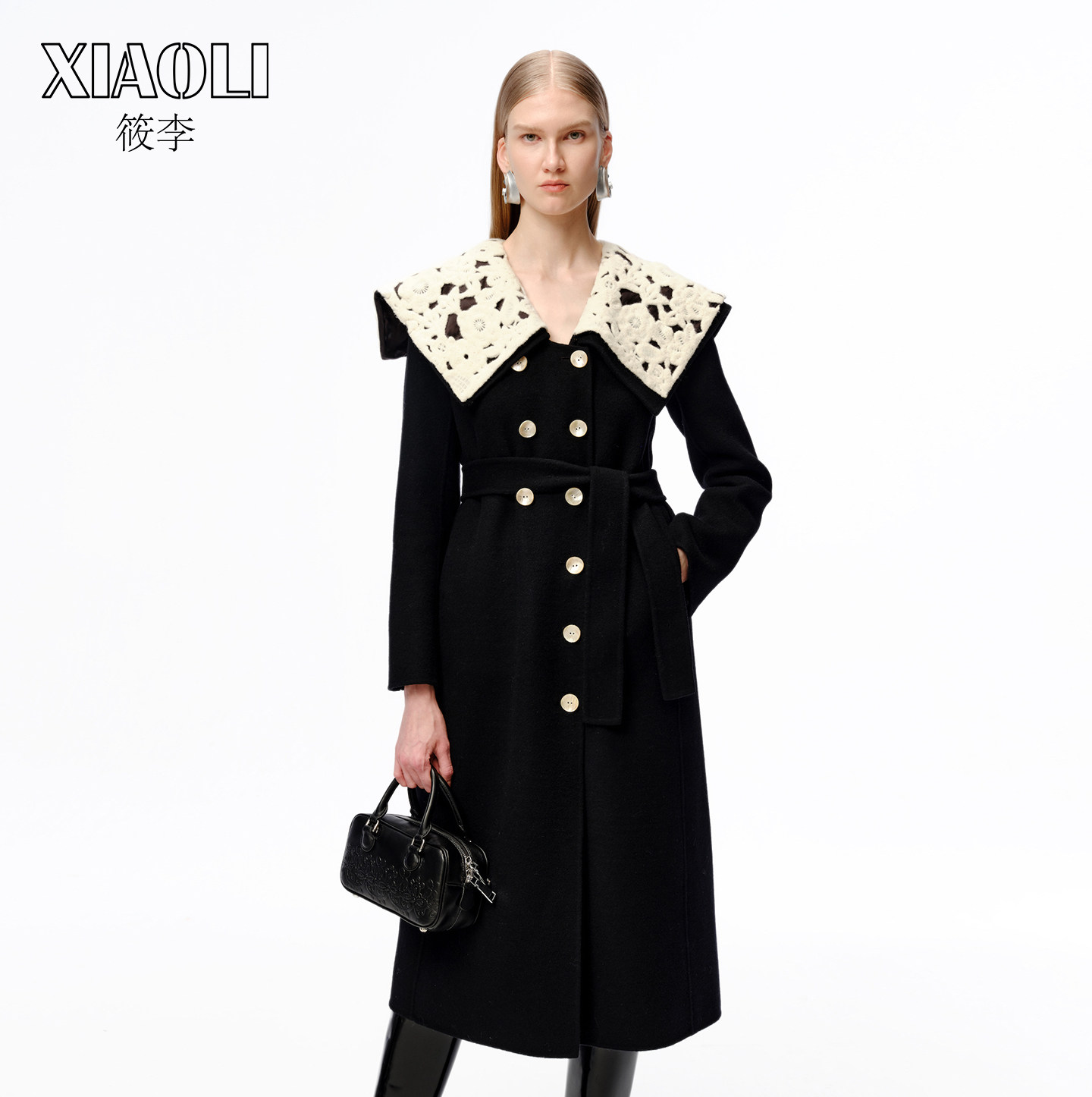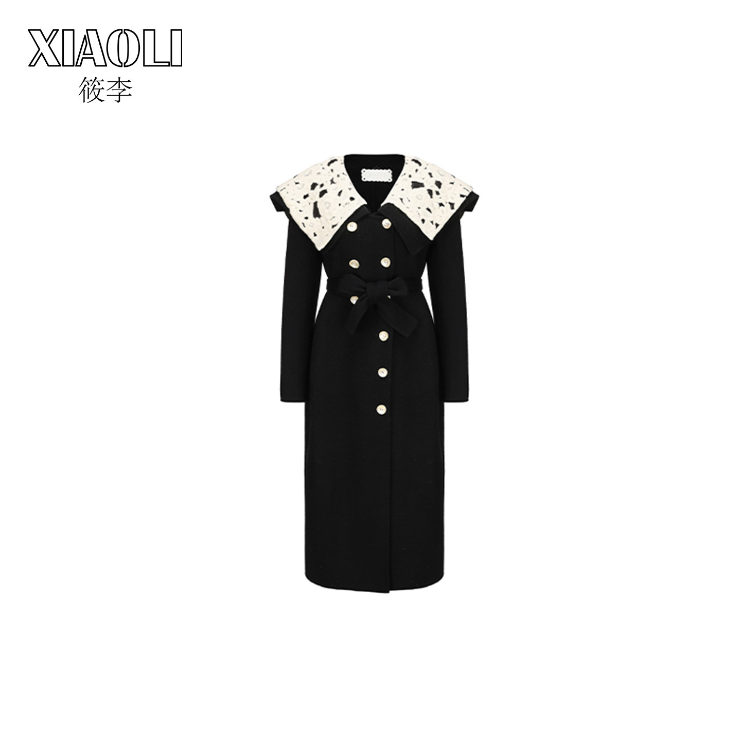 XIAOLI筱李 秋冬新品设计师款黑色海军领双面尼大衣外套
