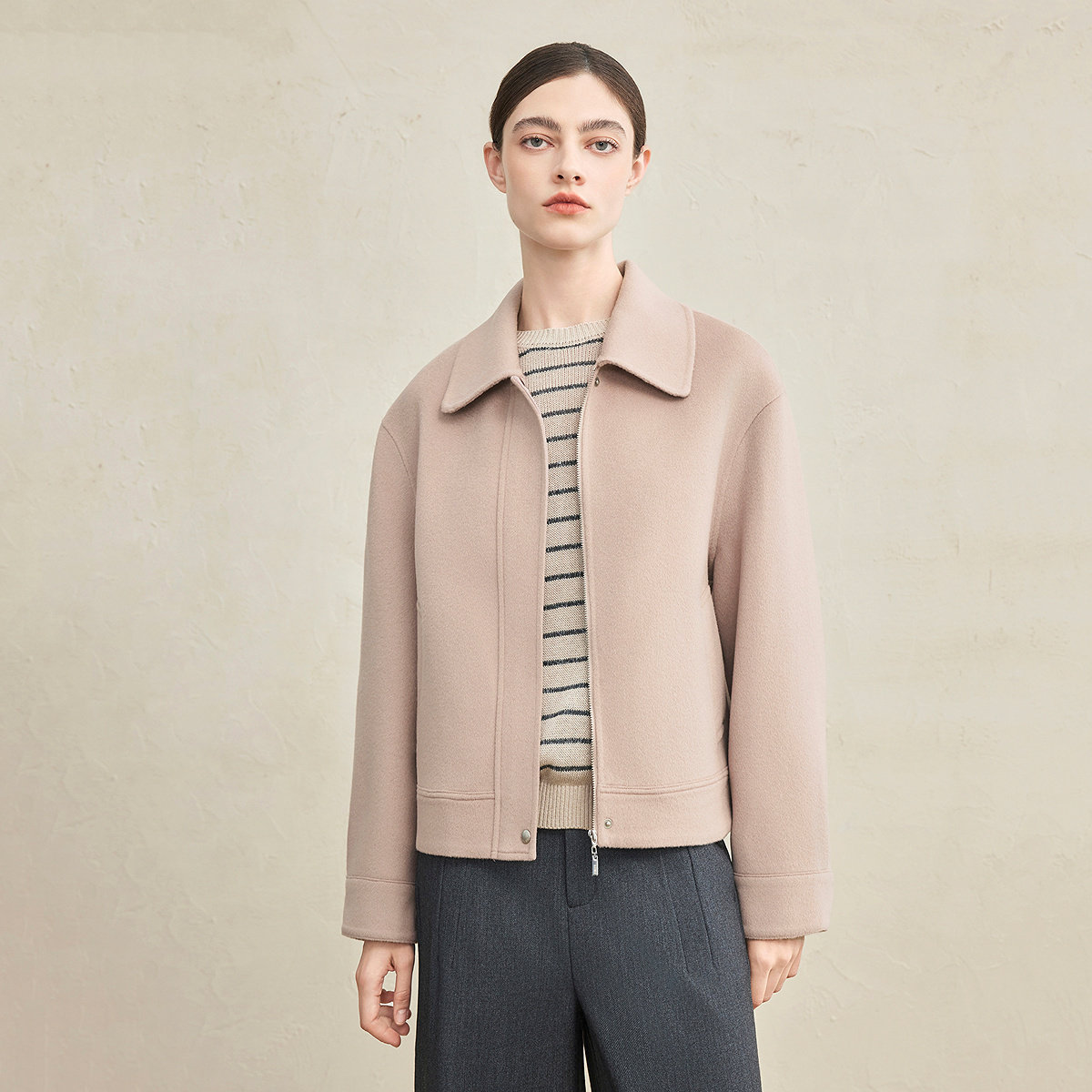 RUISHI芮时重磅驼绒桑蚕丝羊毛慵懒两穿领灰色毛呢大衣秋冬外套女