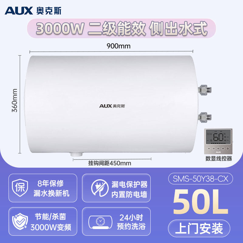 奥克斯电热水器储水式家用3kW变频速热侧出水吊顶装隐藏式50升Y38