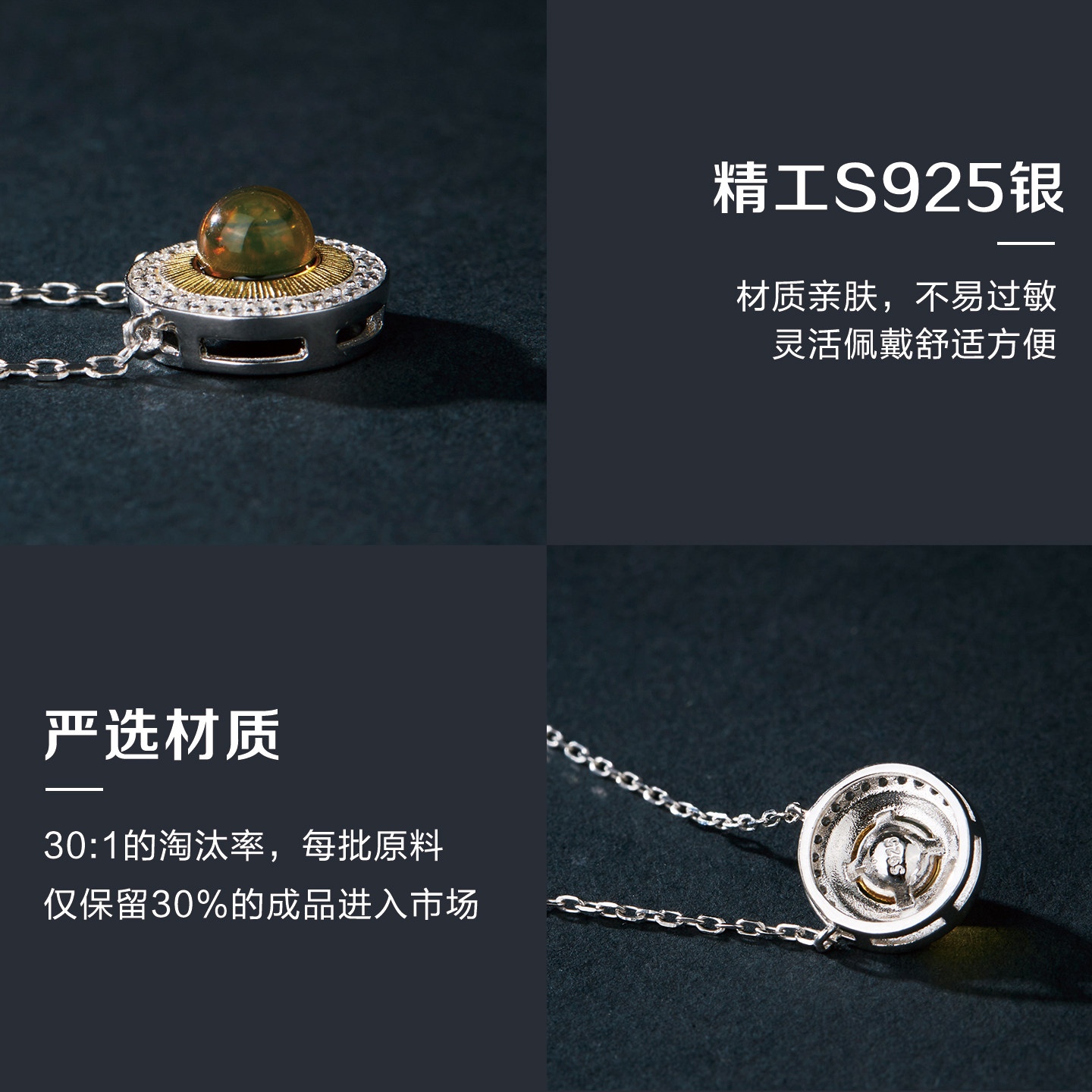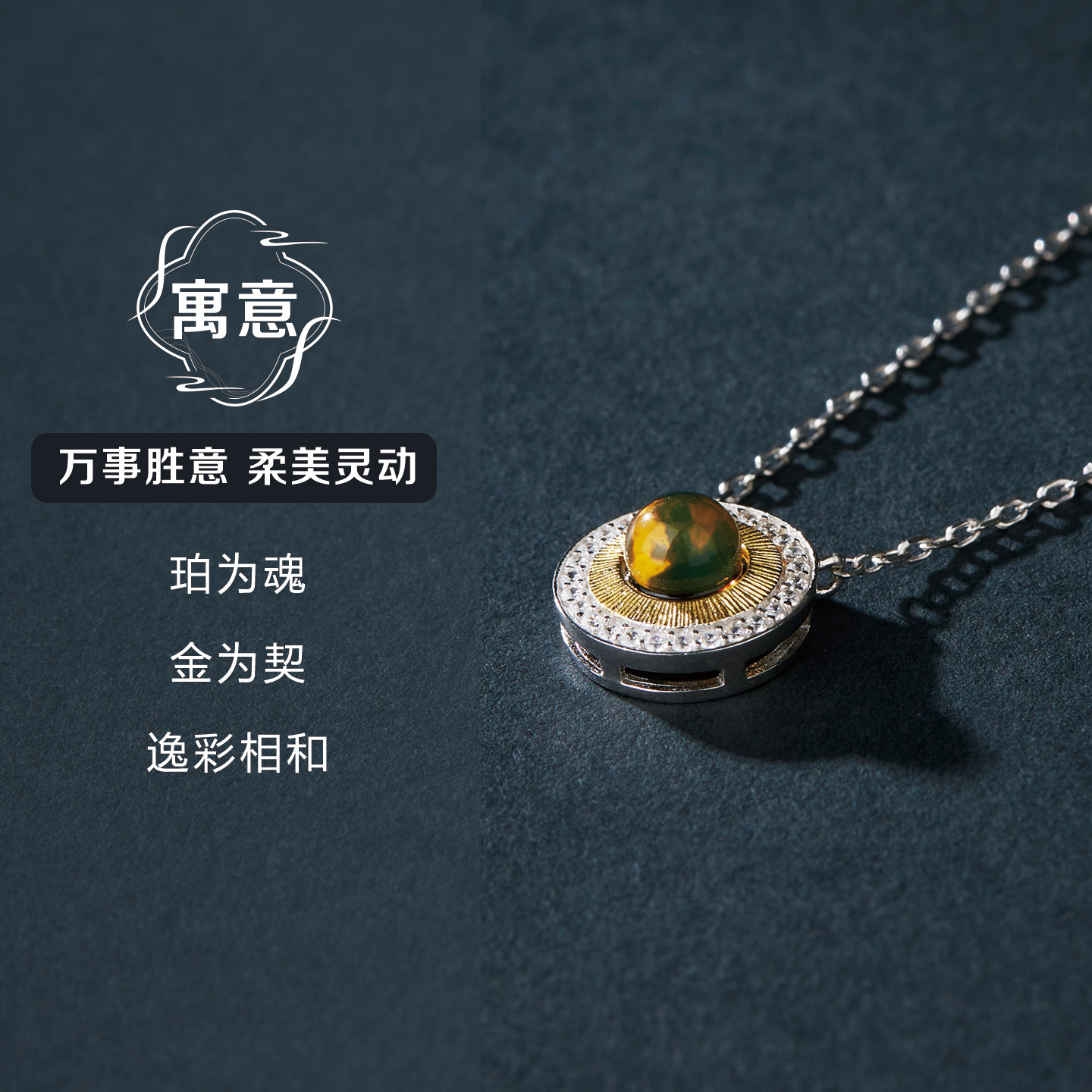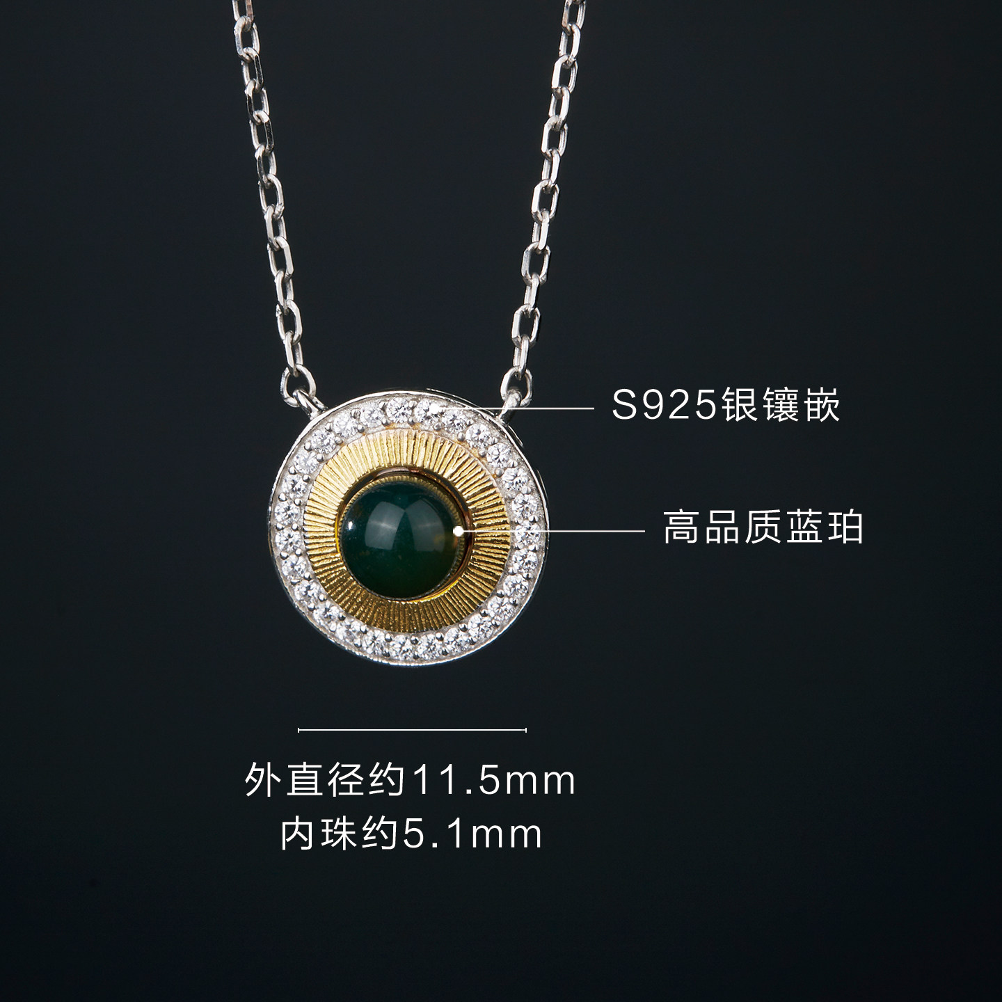 七彩云南蓝珀吊坠天然琥珀项链纯银鎏金挂件S925银挂坠小众高级感
