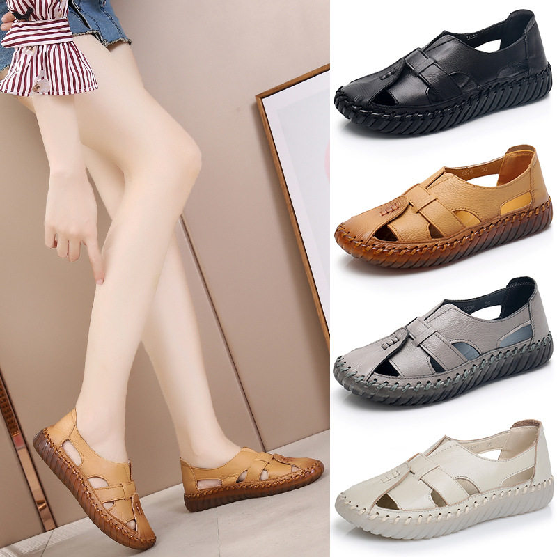 大码妈妈凉鞋真皮软底女夏季平底中老年洞洞鞋防滑牛筋底老人皮鞋