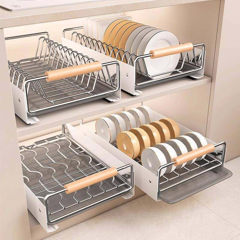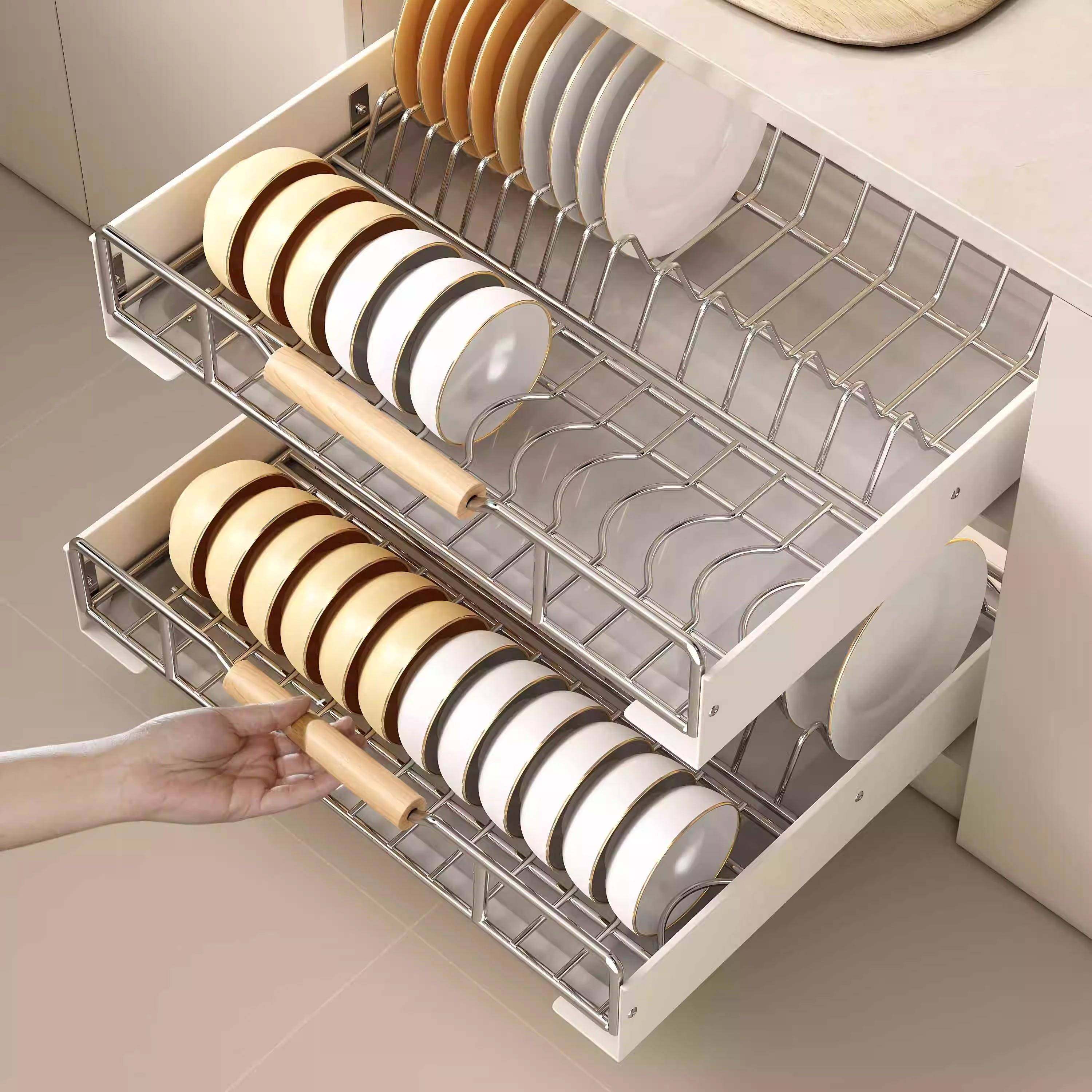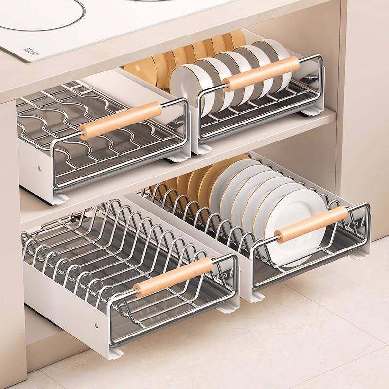 厨房碗盘收纳架碗碟拉篮抽屉式置物架橱柜内沥水抽拉碗篮内置碗架