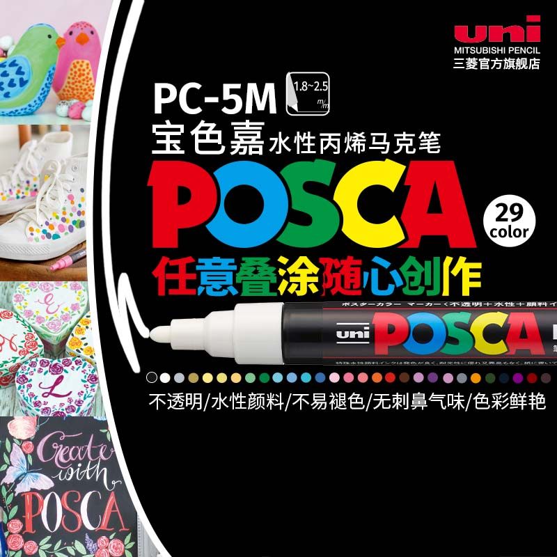 日本uni三菱宝色嘉POSCA PC-5M水性丙烯马克笔POP海报涂鸦手绘彩色记号笔1.8-2.5mm速干防水美术院校动漫设计