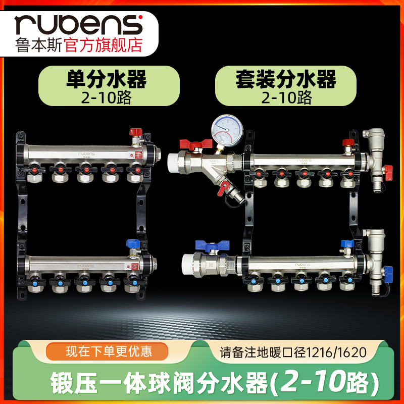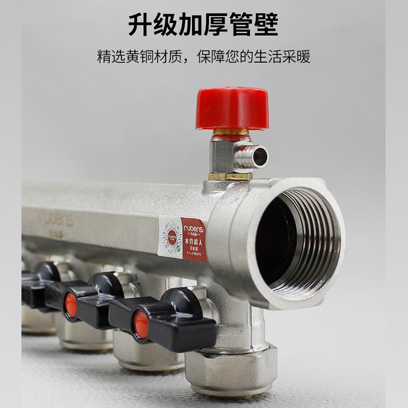 鲁本斯地暖分水器集4路5路家用全铜一体大流量地暖管全套球阀配件