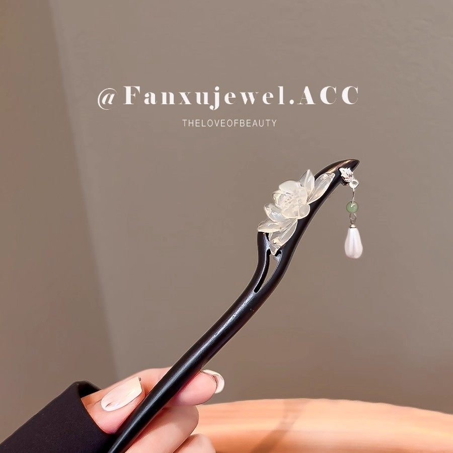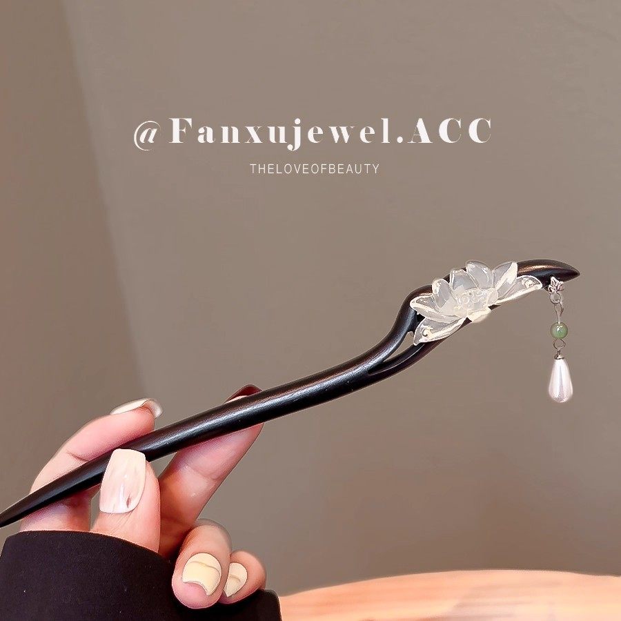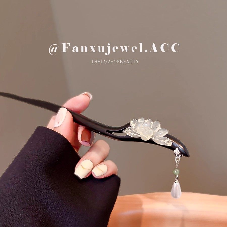 新中式莲花流苏檀木发簪女高级感发钗后脑勺盘发簪子汉服头饰双面