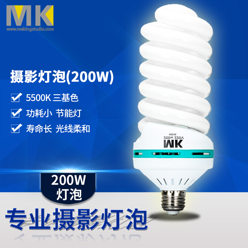 MK200W棚拍摄影节能灯泡补光灯5500K三基色影室白光灯柔光箱专用