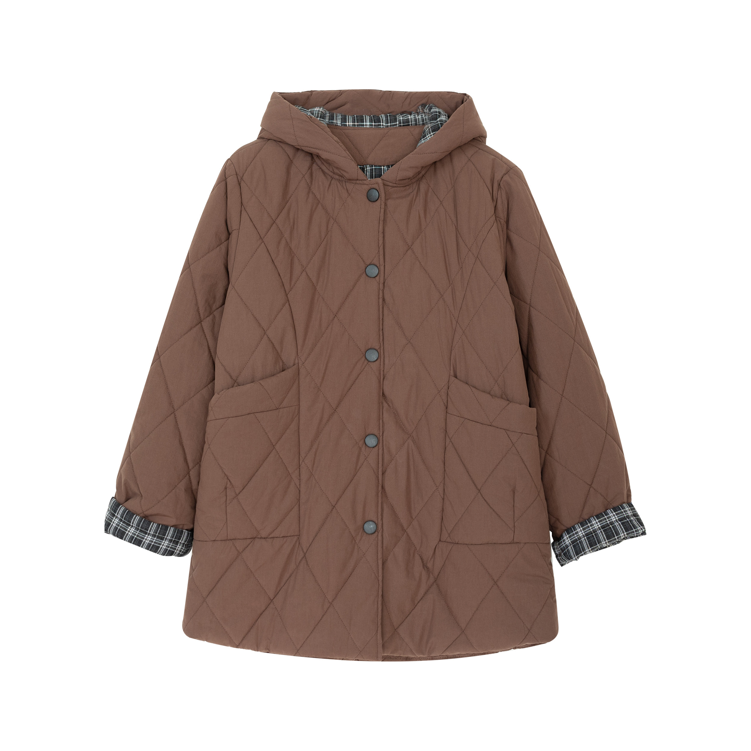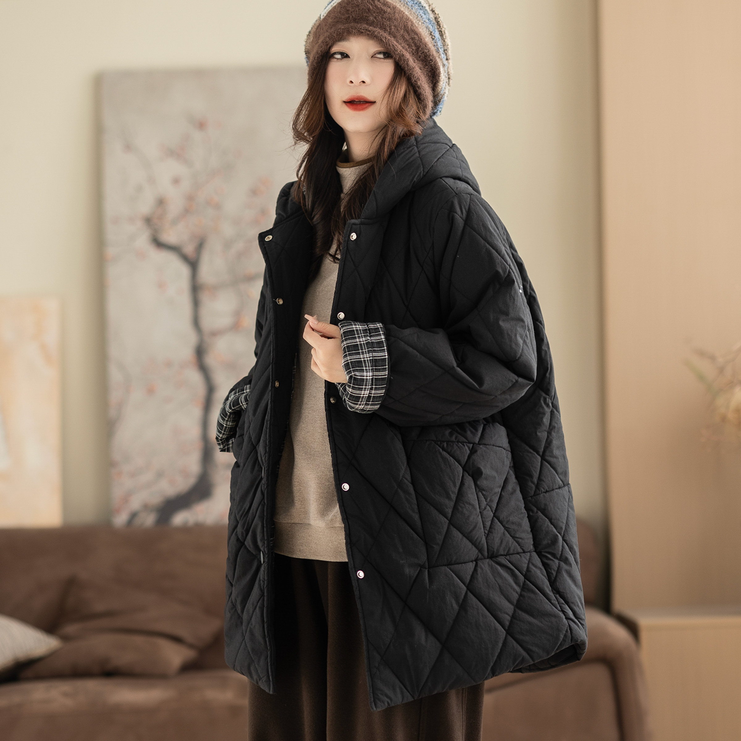 咖咪羽复古纯棉内里夹棉加厚棉服外套拼接中长款菱形格保暖棉袄女