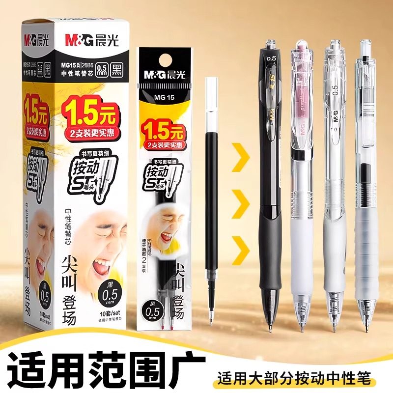 晨光尖叫按动中性笔笔芯ST头刷题笔替芯0.5mm速干学生考试用黑色笔芯按动笔通用替换芯水笔芯碳素笔替芯