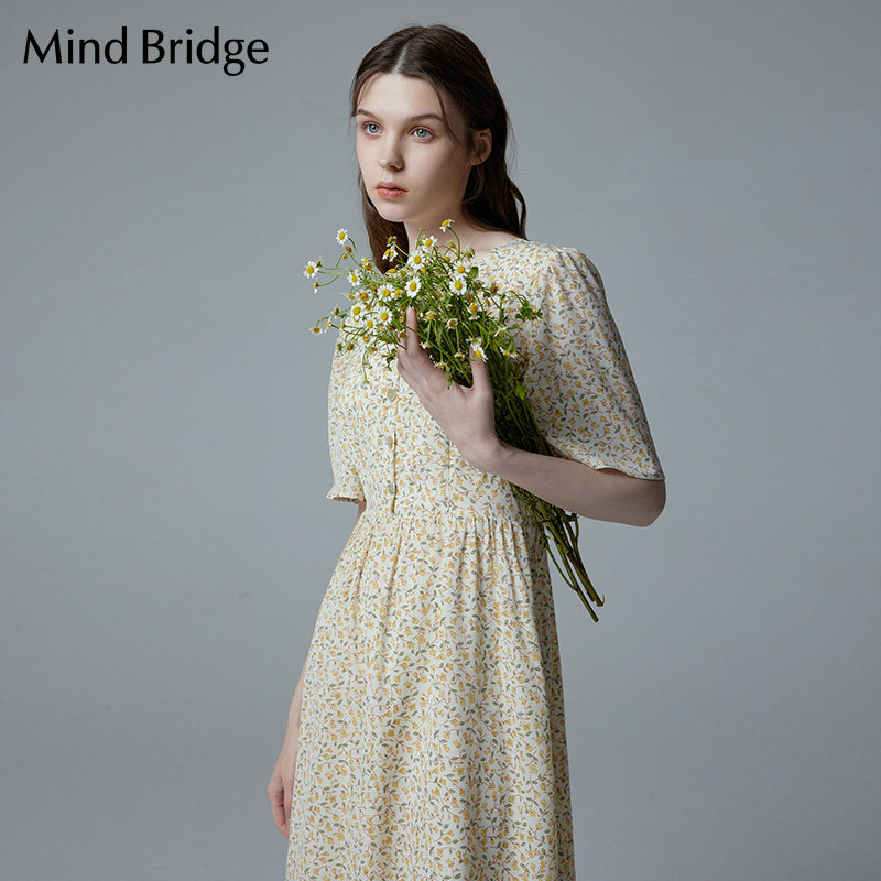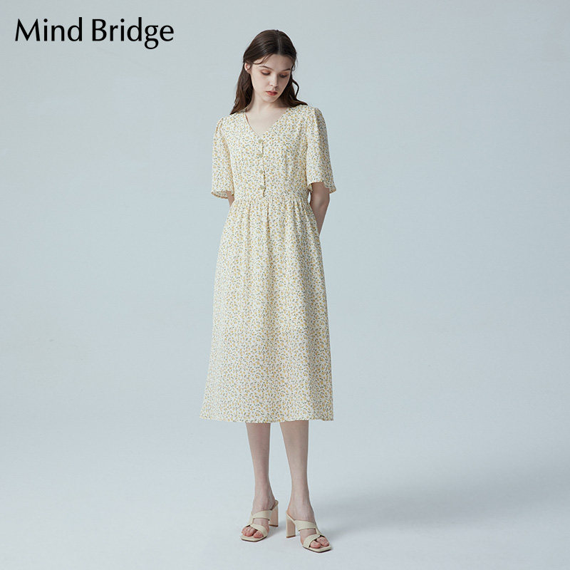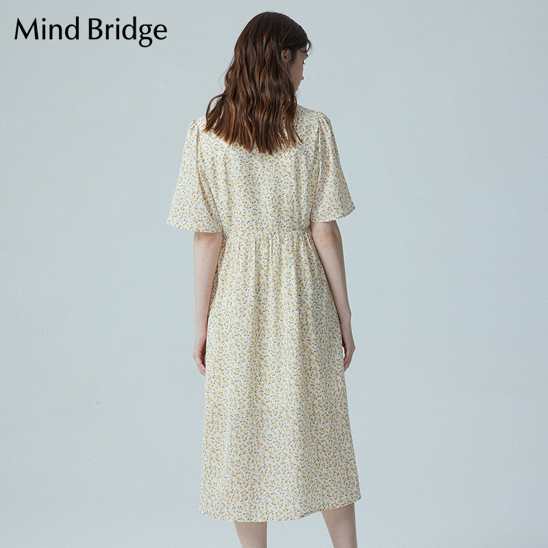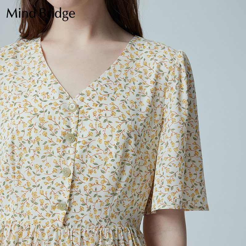Mind Bridge女士碎花连衣裙夏季气质V领印花长裙收腰显瘦通勤裙子